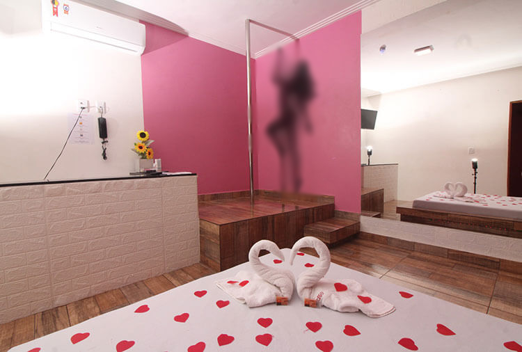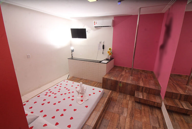 Destaque: a suíte Luxo oferece uma experiência única, com uma cama de estilo oriental e uma Smart TV para momentos de conforto e lazer. Para aqueles que buscam explorar novas sensações, a suíte também conta com acessórios exclusivos, como algemas, chicotes e um pole dance, proporcionando diversão e entretenimento