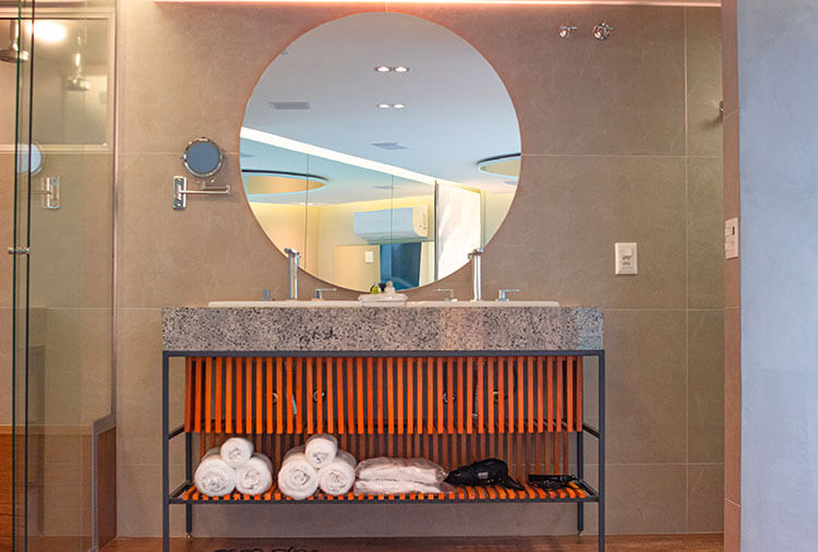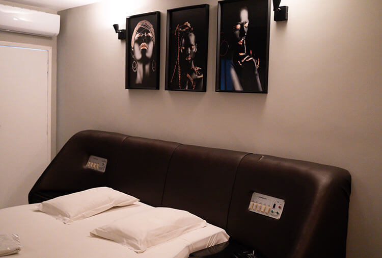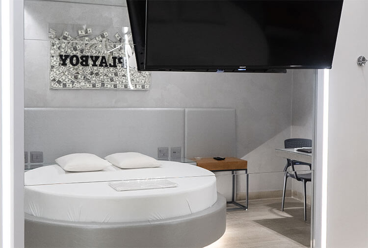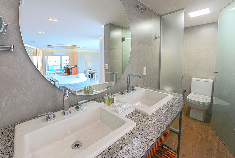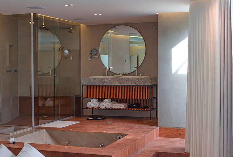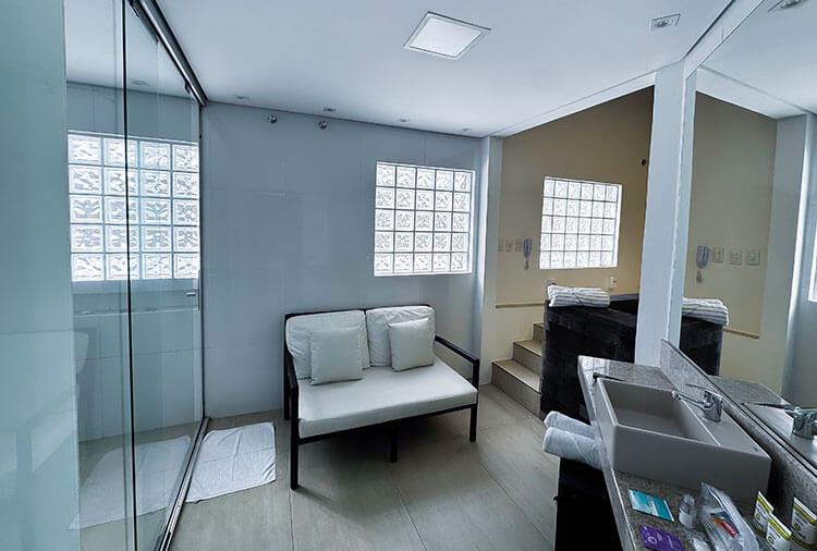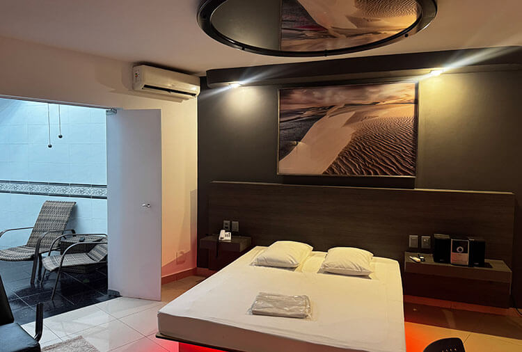 Suítes equipadas com: ar-condicionado, ducha, frigobar, internet wi-fi, garagem privativa automática, saleta para refeições, som e TV
