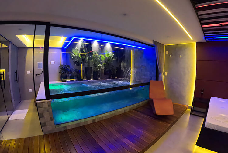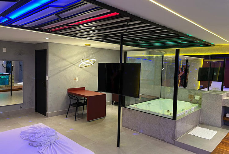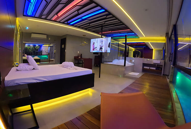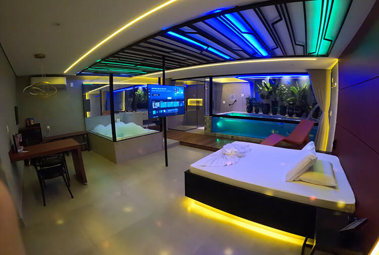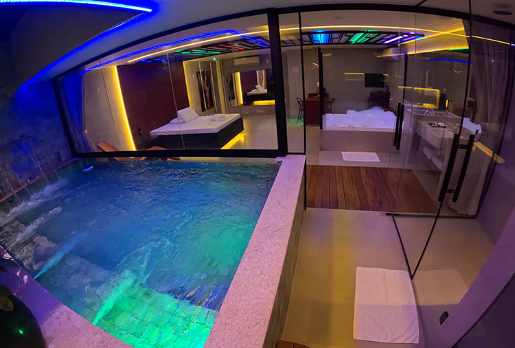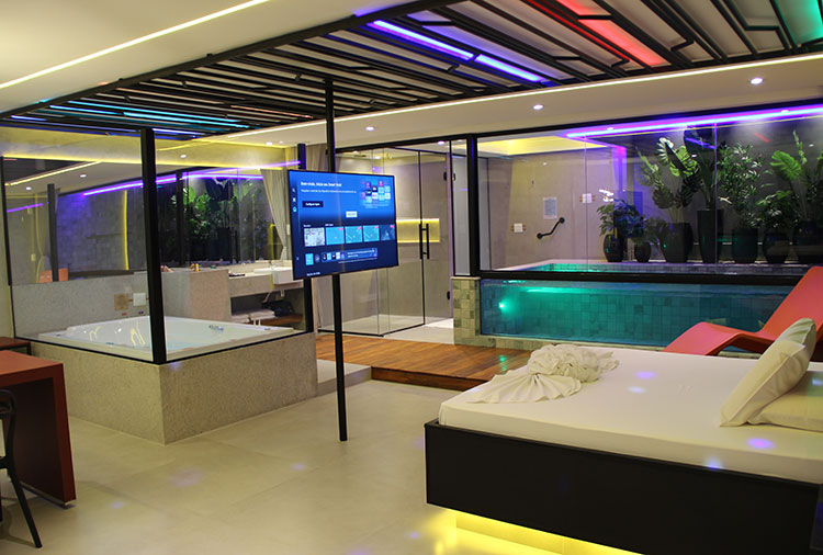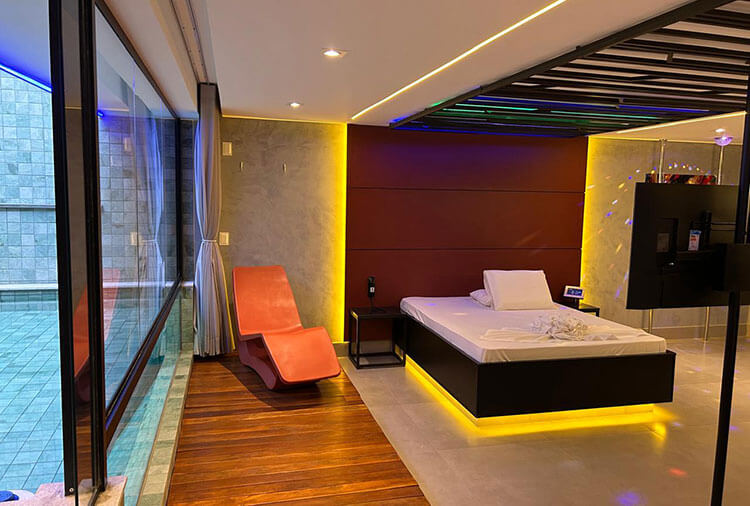 Destaque: A nova e aconchegante suíte Master dispõe de hidromassagem, piscina privativa, barra com algemas, além de serviço de restaurante 24 horas para maior comodidade.