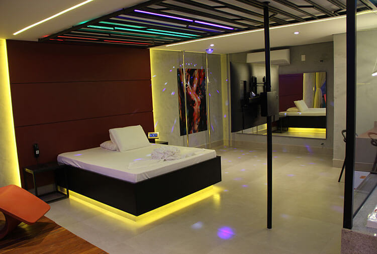 Suítes equipados com: ar-condicionado, ducha, frigobar, garagem privativa, som e TV com canal erótico