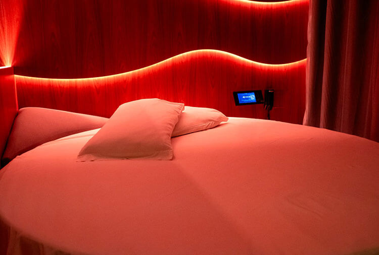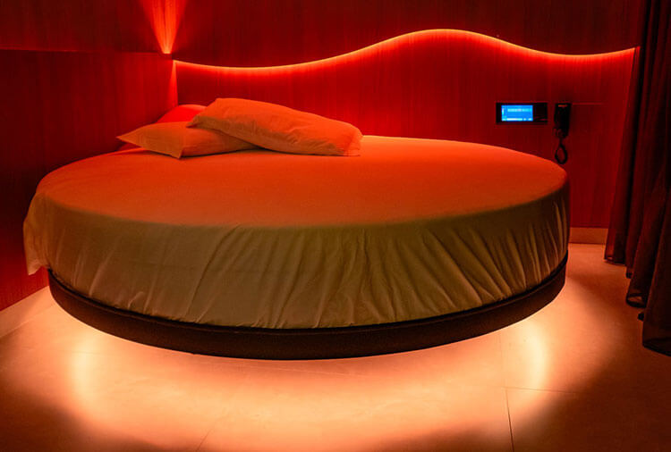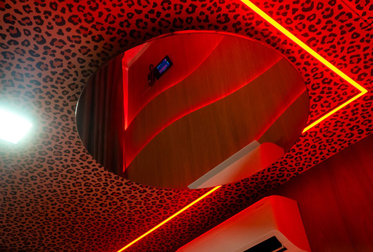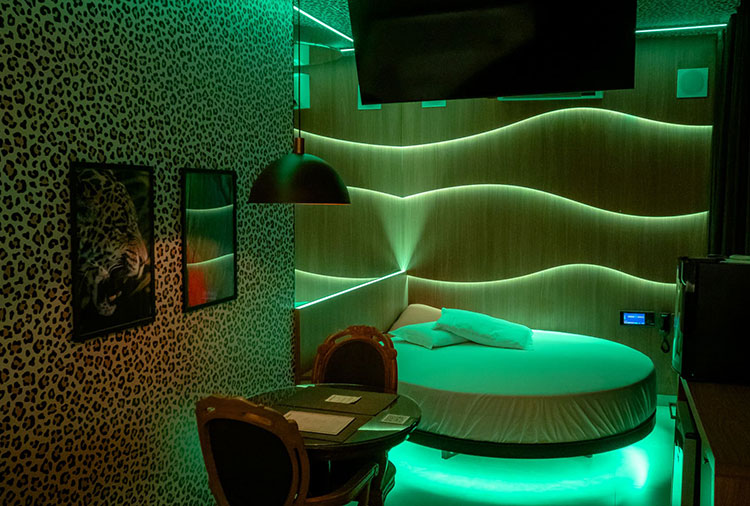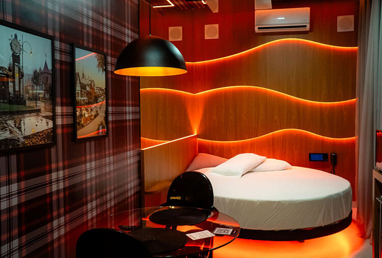 Equipadas com: ar-condicionado, ducha, frigobar, garagem privativa, iluminação especial, mesa para refeições e TV com canais eróticos e musicais.