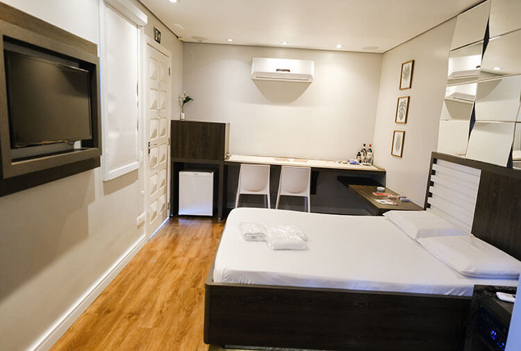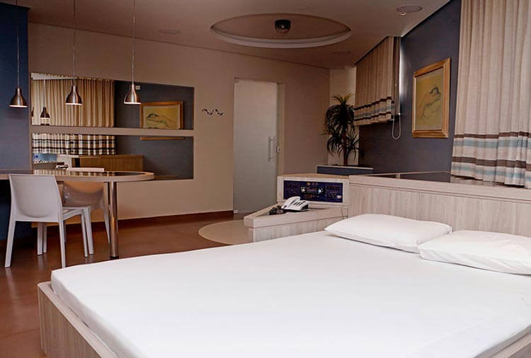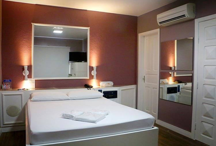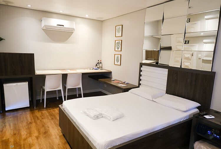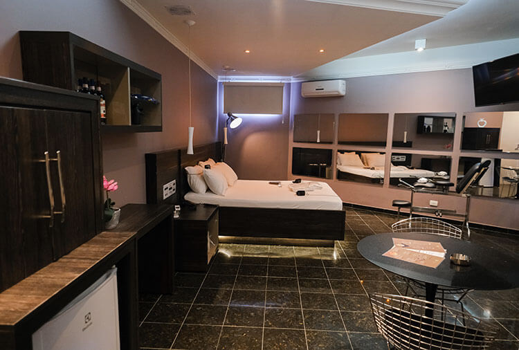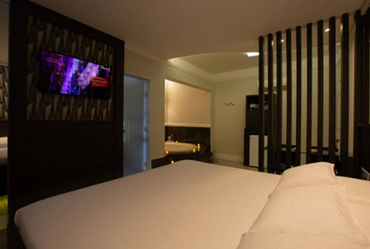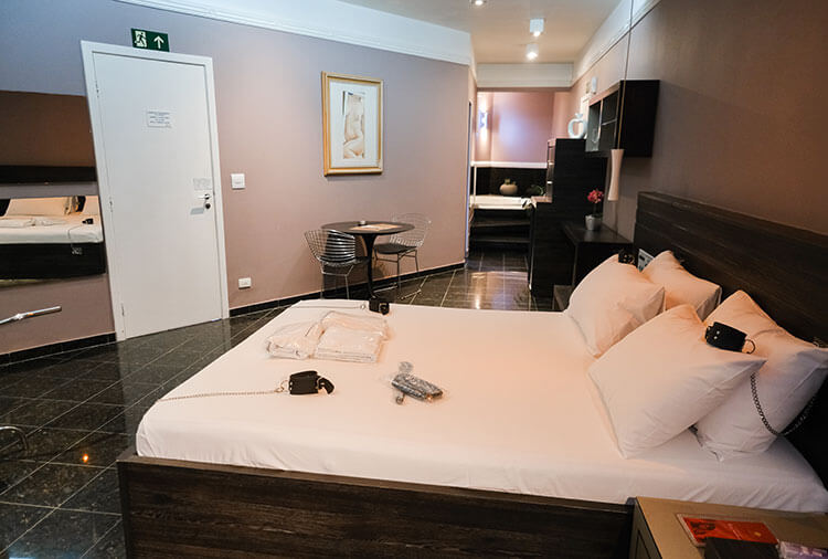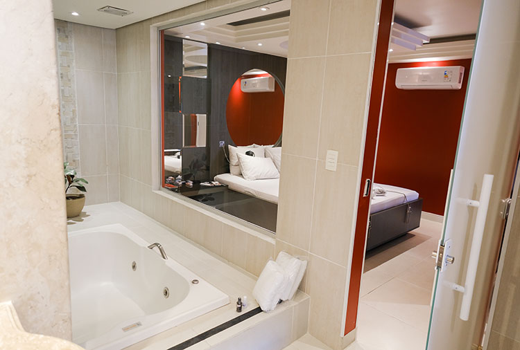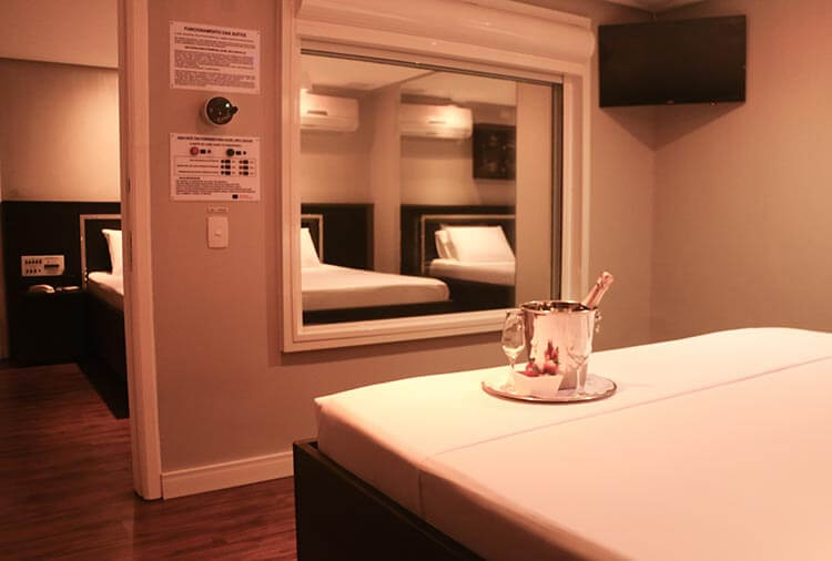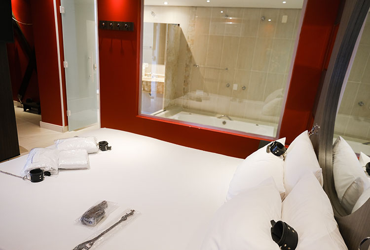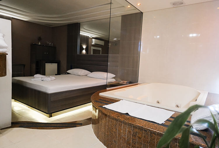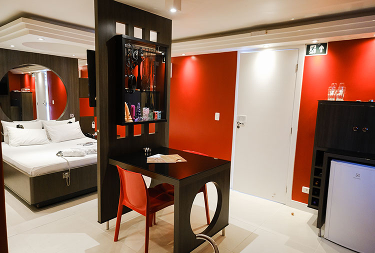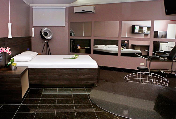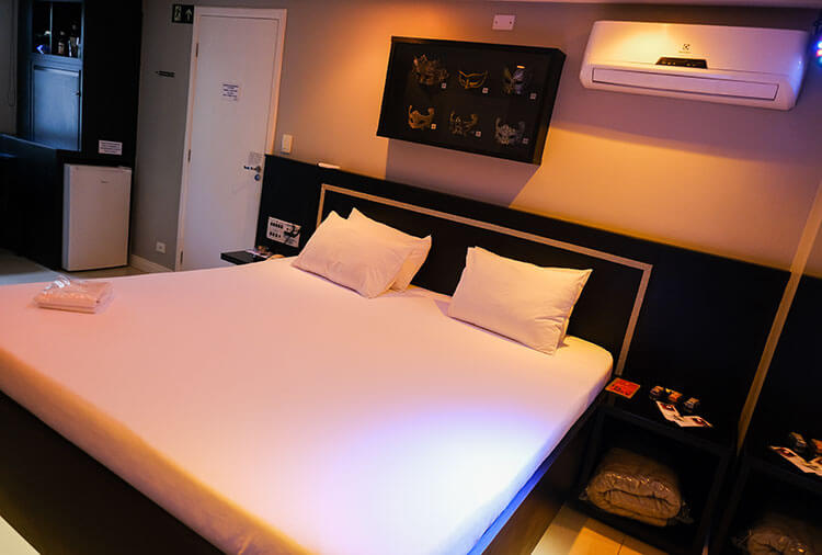 Suítes equipadas com: ar-condicionado, frigobar, som ambiente e TV com canal erótico