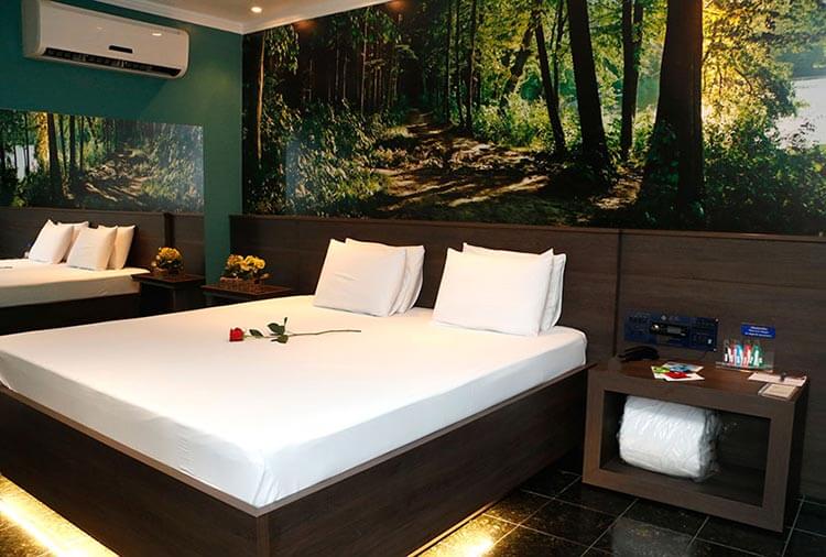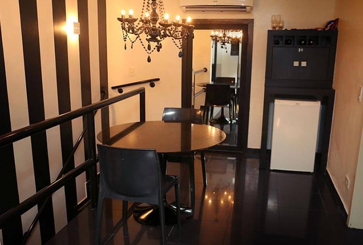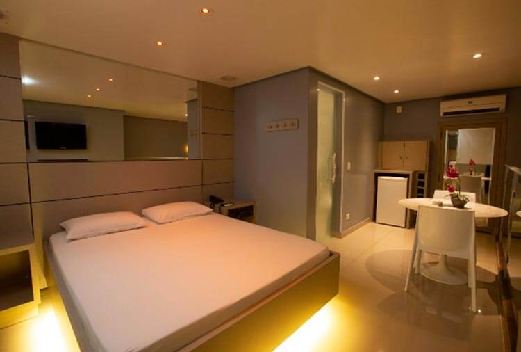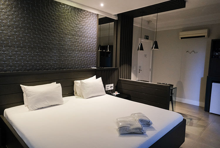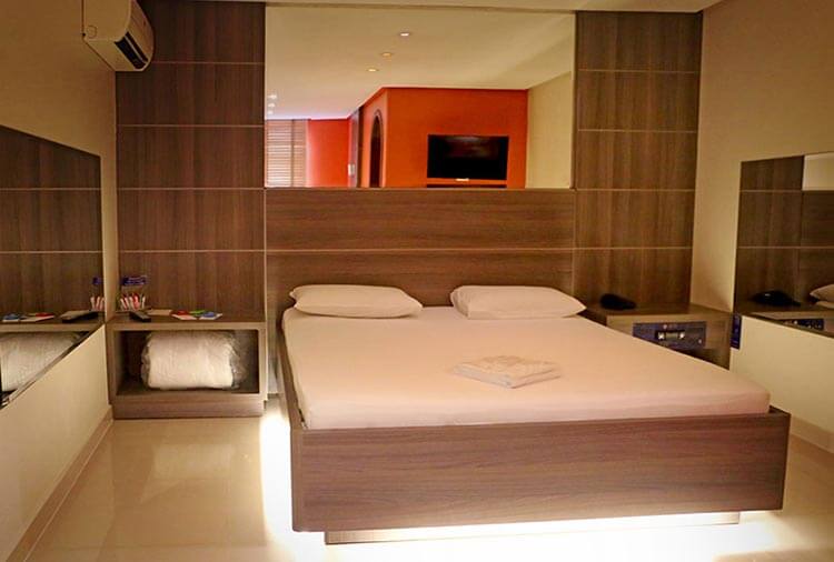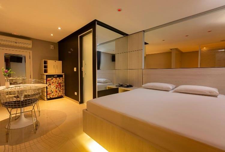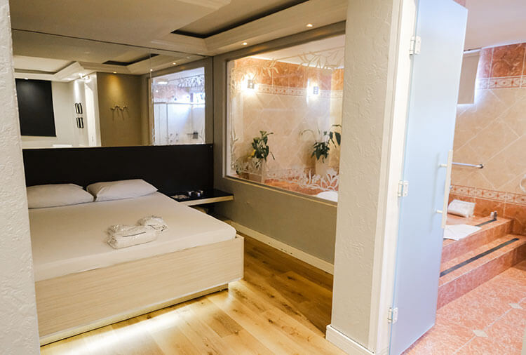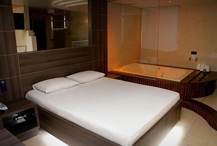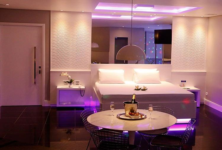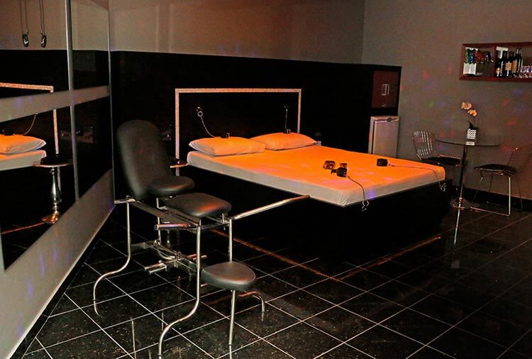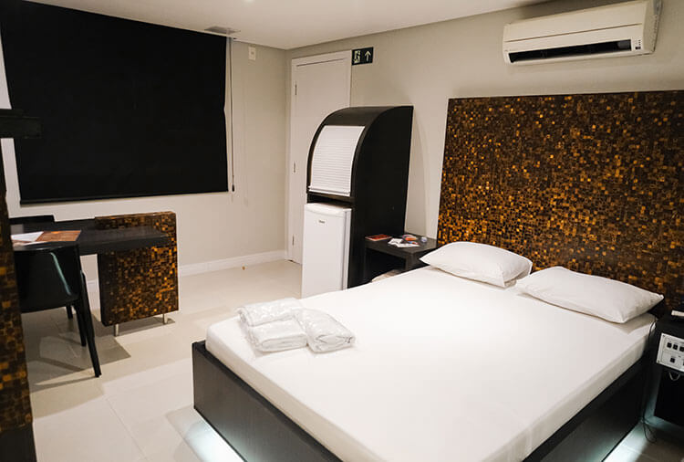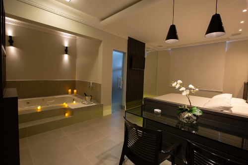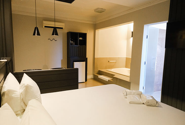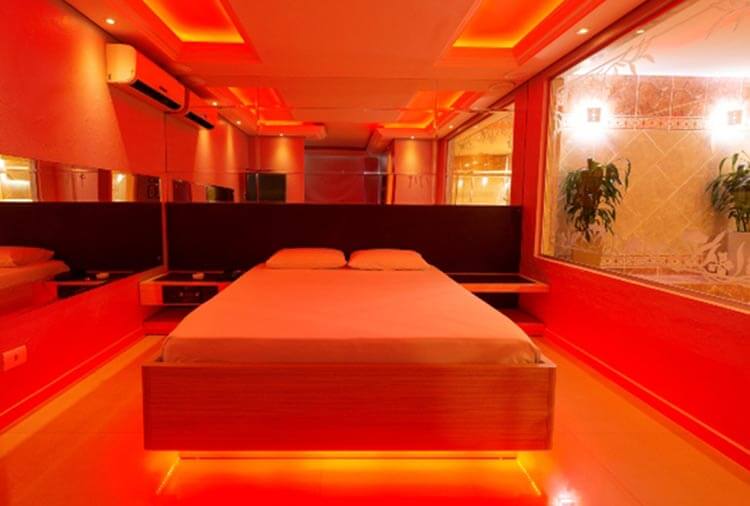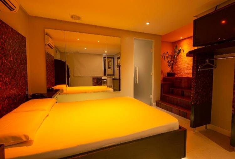 Suítes equipadas com: ar-condicionado, frigobar, som ambiente e TV com canal erótico