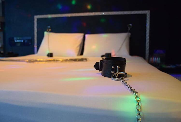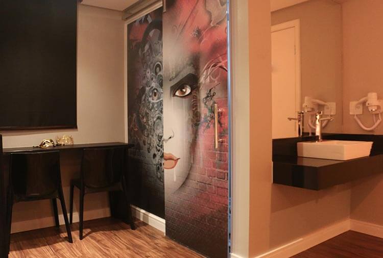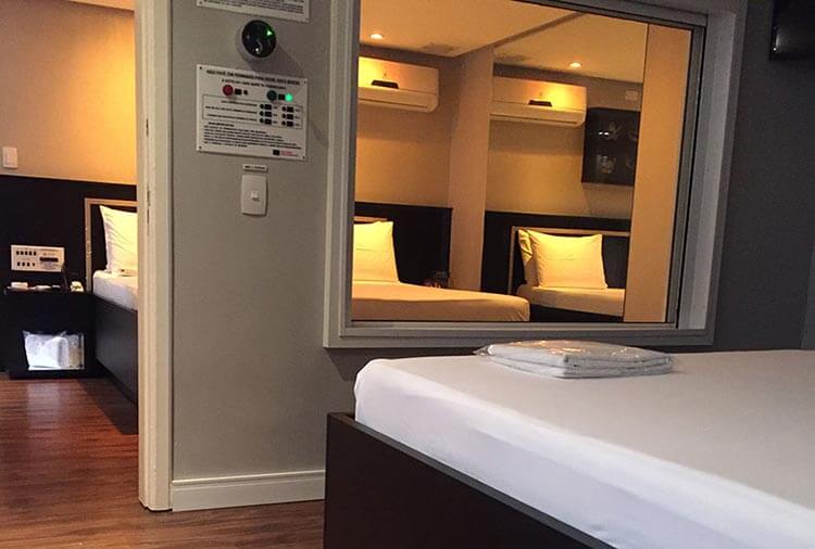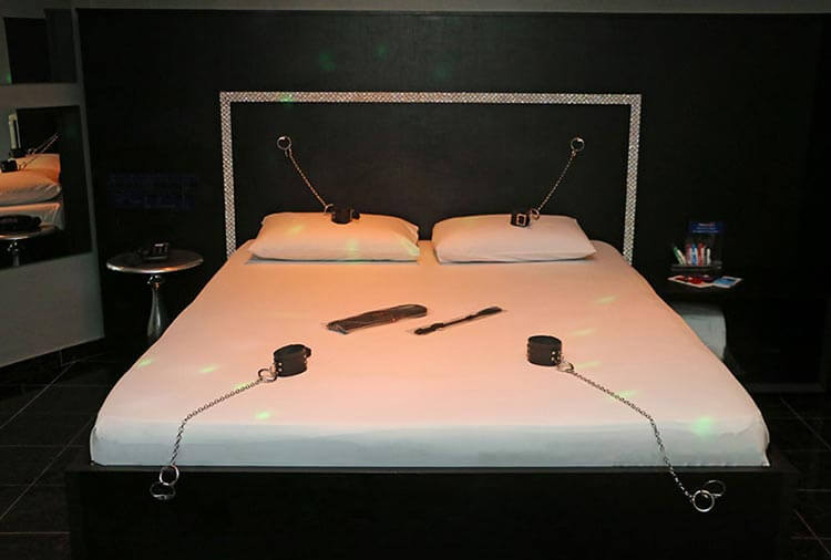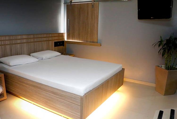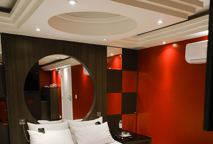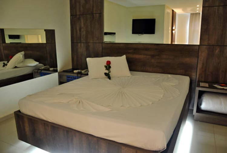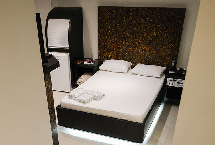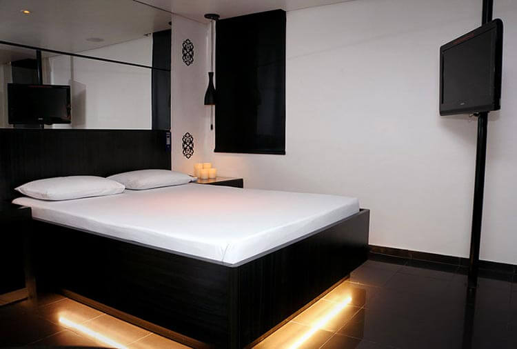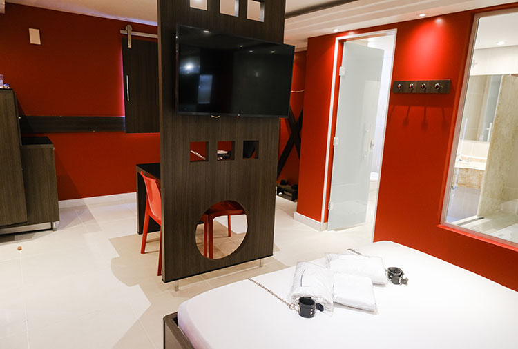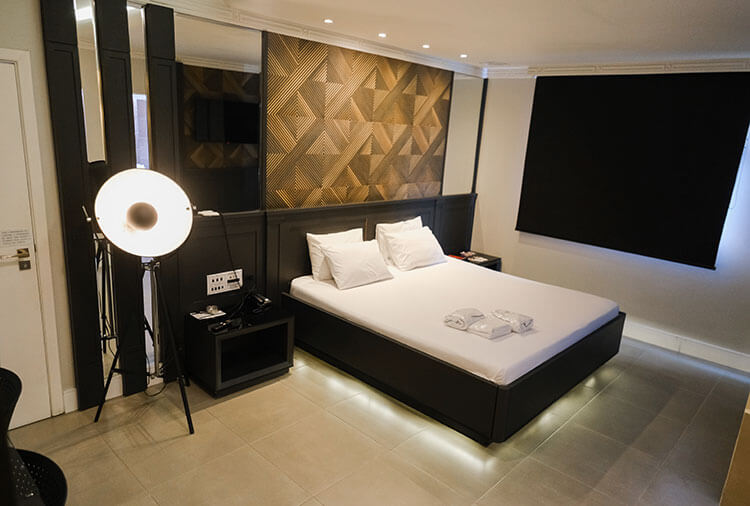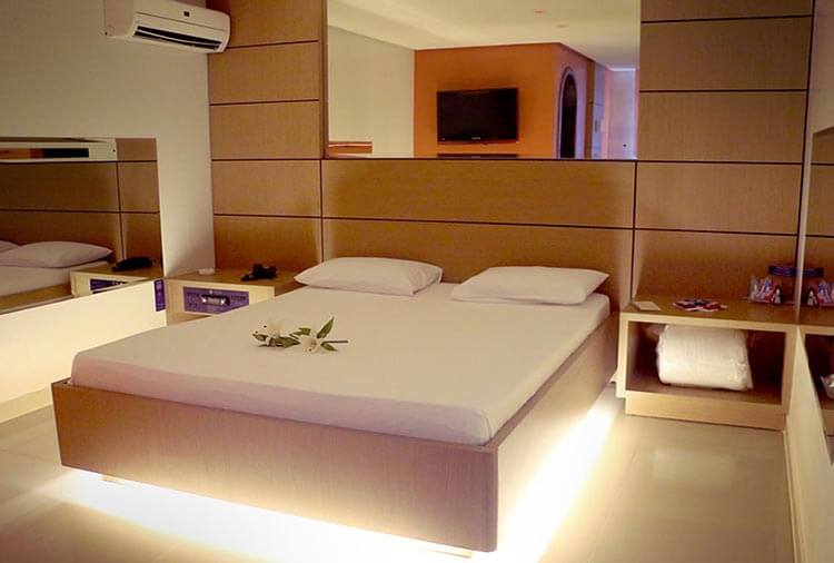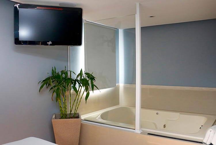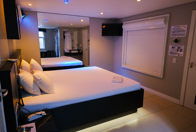 Suítes equipadas com: ar-condicionado, frigobar, som ambiente e TV com canal erótico
