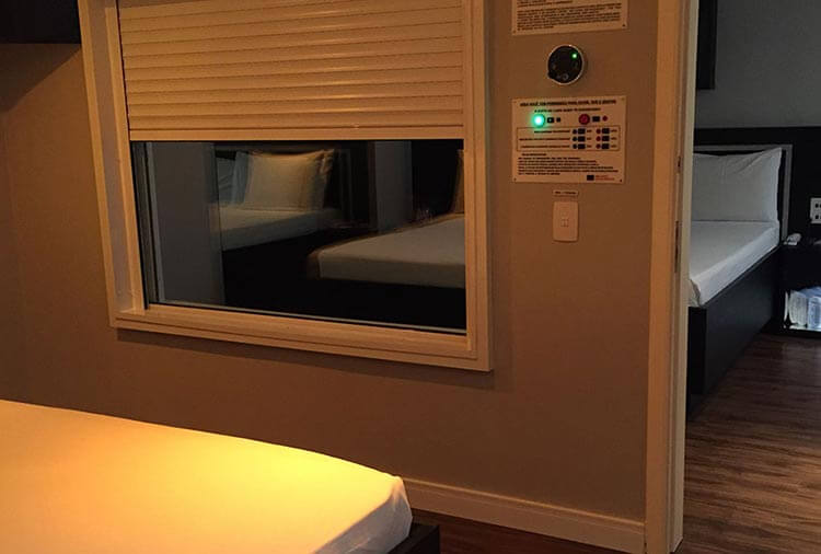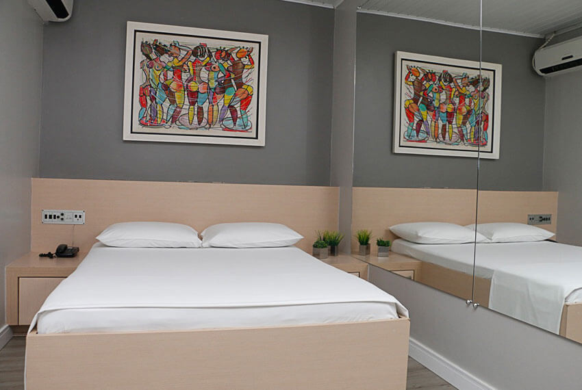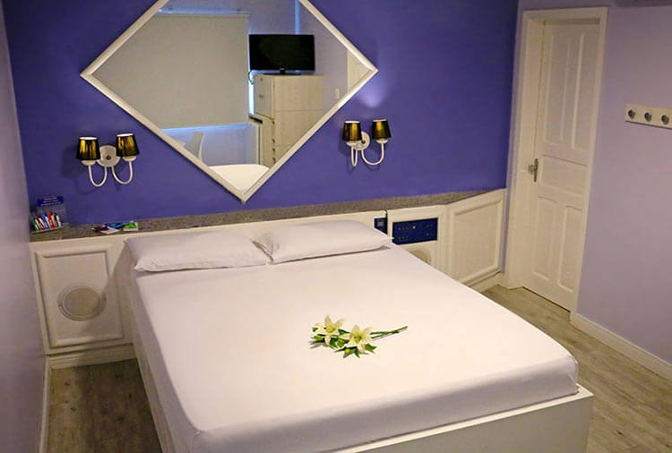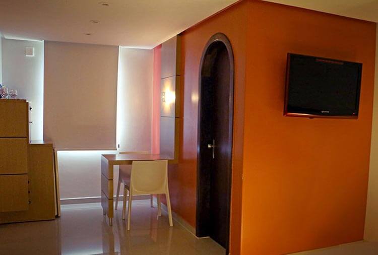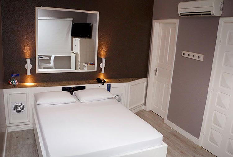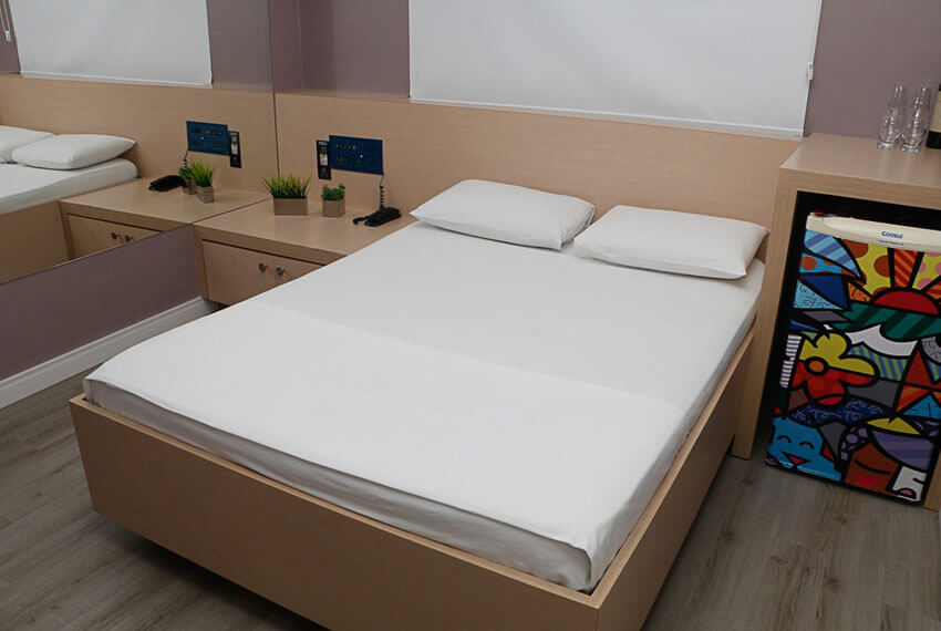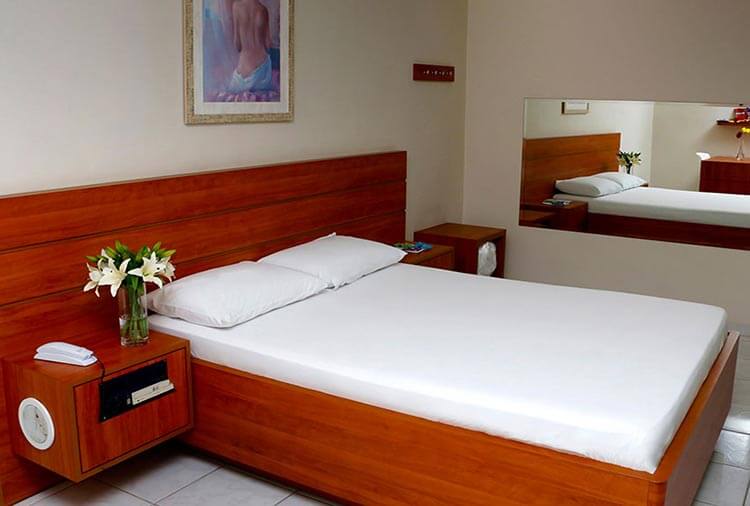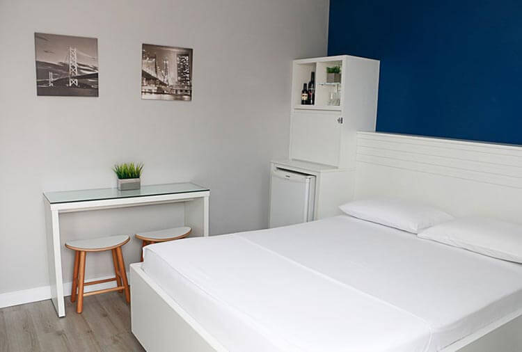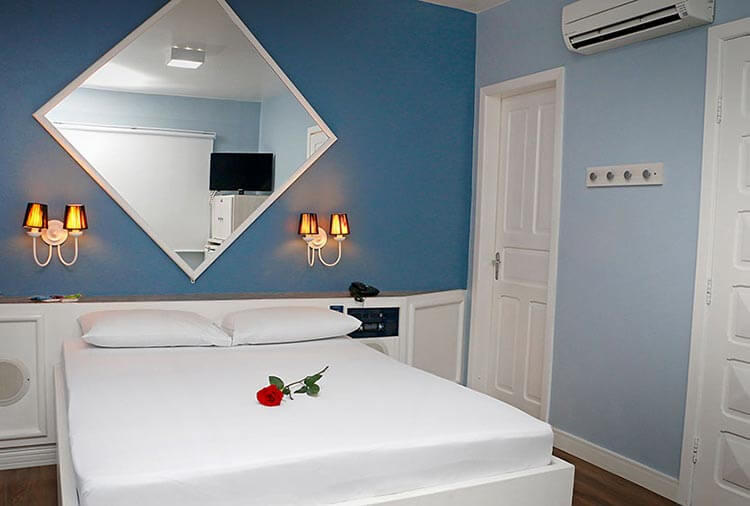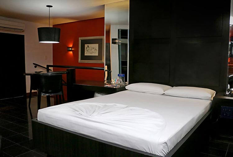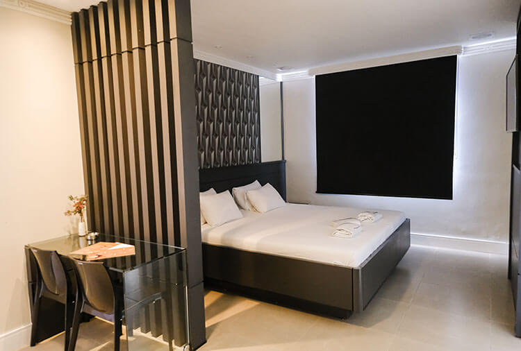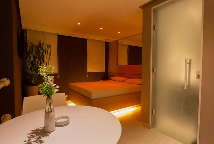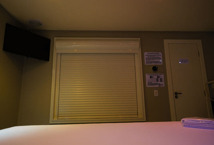 Suítes equipadas com: ar-condicionado, frigobar, som ambiente e TV com canal erótico
