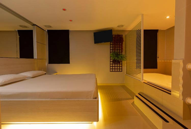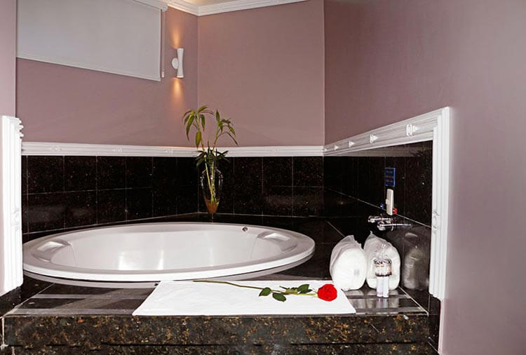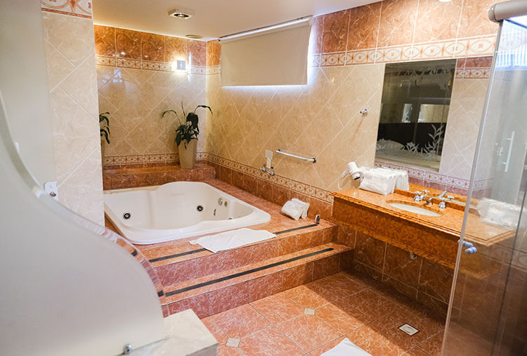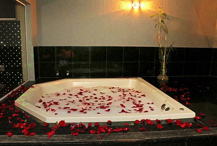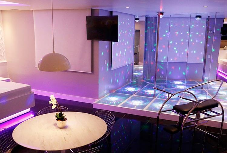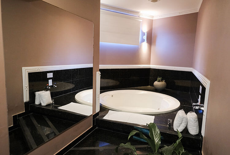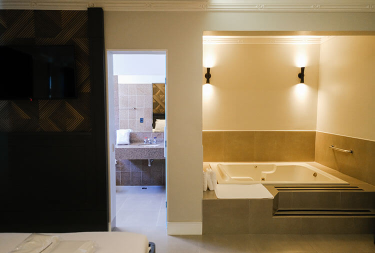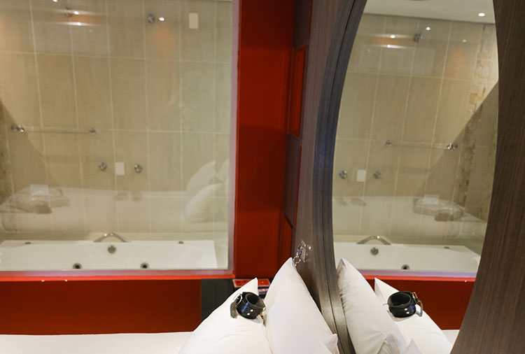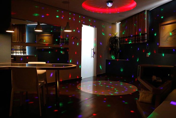 Destaque: a suíte Le Ton é espaçosa e conta com hidromassagem SPA para até 4 pessoas, pista de dança, piso de vidro com LED e espelho na parede, o cenário perfeito para momentos inesquecíveis
