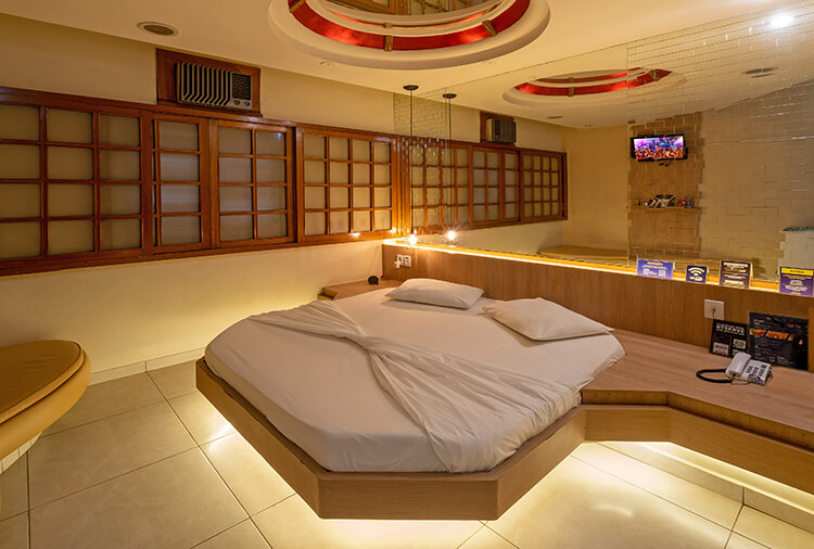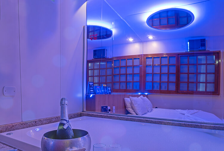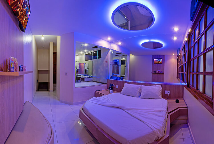 Suítes equipados com: ar-condicionado, canal erótico, frigobar, garagem privativa, som e TV