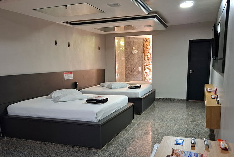 Destaque: a Suíte Dual Luxo, ideal para até 4 pessoas, equipada com duas camas king size, hidromassagem e uma TV de 46 polegadas para o máximo conforto e lazer
