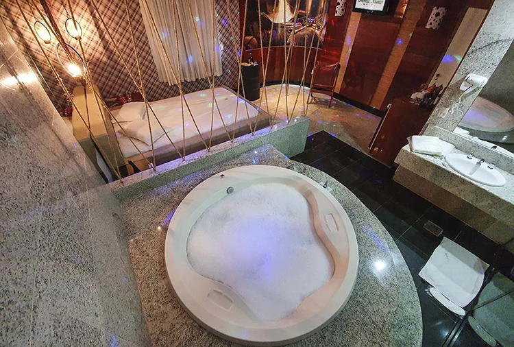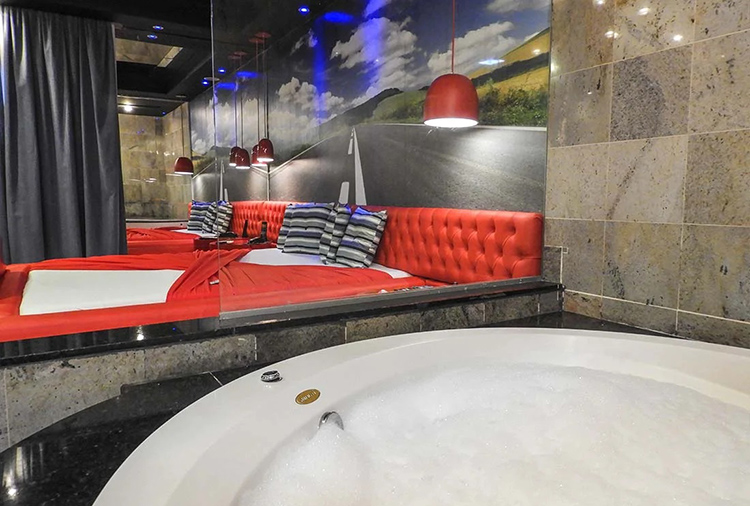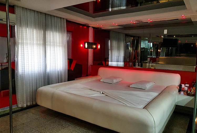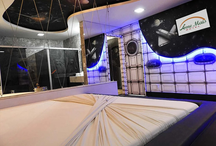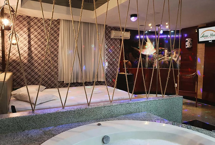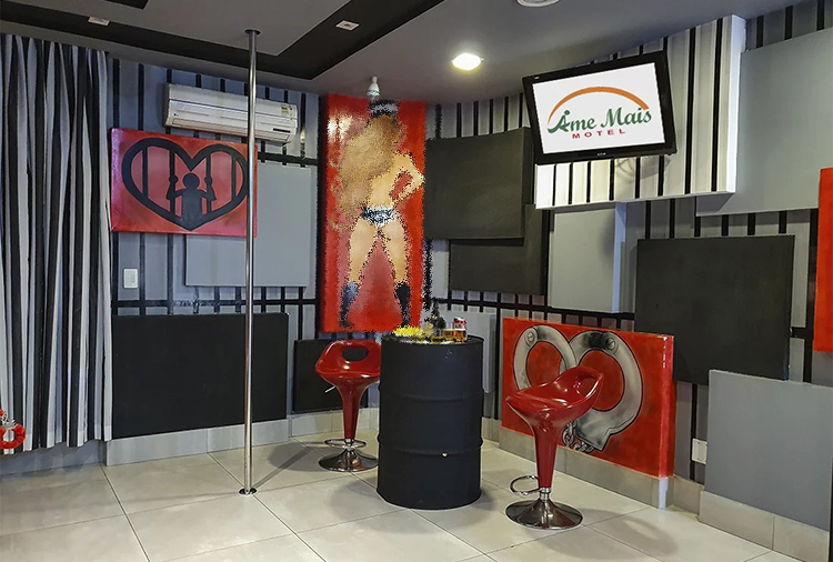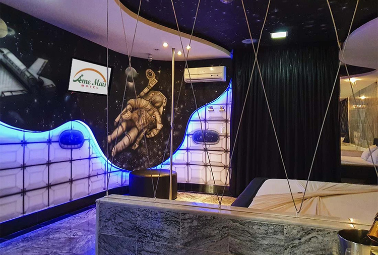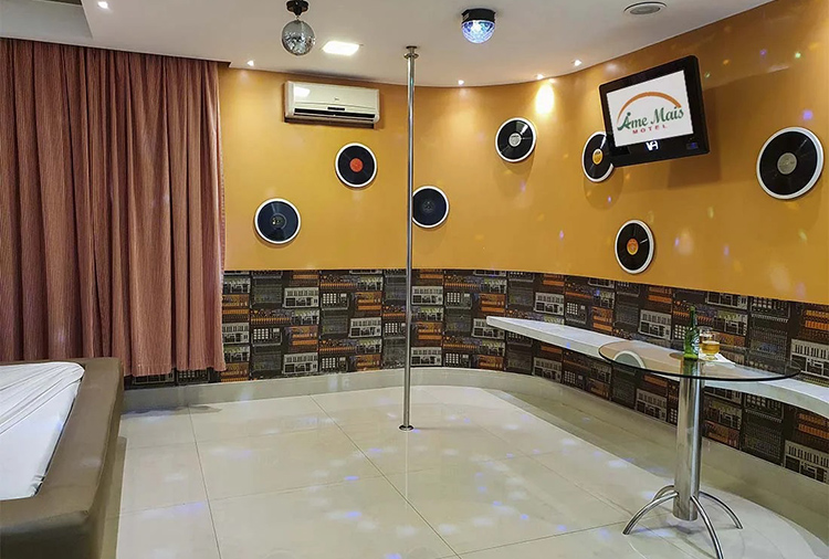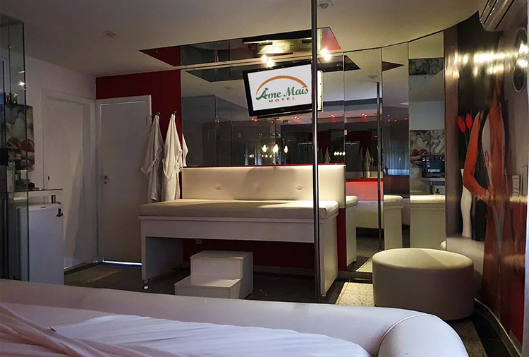 Destaque: com o nome do motel, a suíte Ame Mais é ideal para festas, pois conta com pista de dança e iluminação especial, além de sauna a vapor e spa