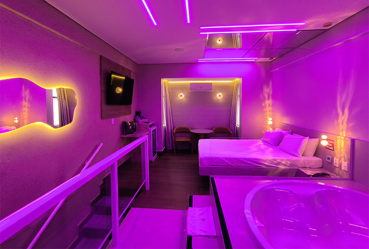 Suítes equipadas com: ar-condicionado, internet Wi-Fi, frigobar, garagem Privativa, som e TV com canal erótico