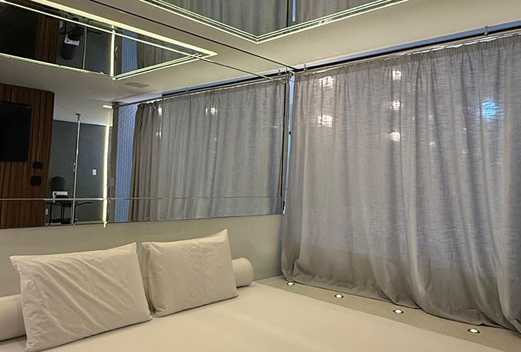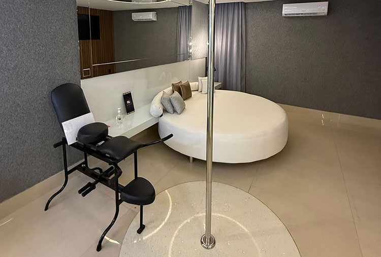 E mais: Na suíte Fetiche é possível optar por um dos seguintes temas: Colegial, Enfermeira, Policial, Safari, Natureza, Disco, Romântica e Cowboy. Já na categoria temática há a opção dos temas Cristal, Inglesa, Japonesa, Marroquina e Multicolor, e a hidromassagem está entre os itens. Para clientes cadeirantes, a suíte Especial foi projetada para atendê-los com conforto e satisfação.