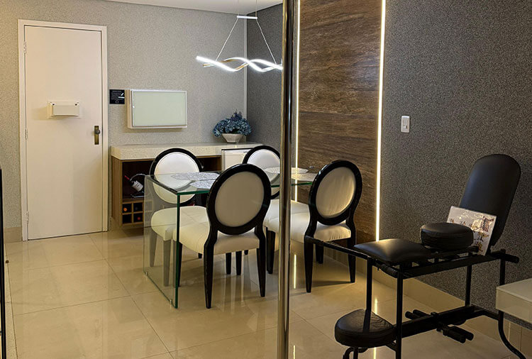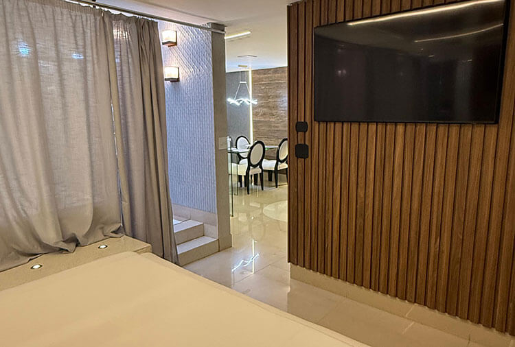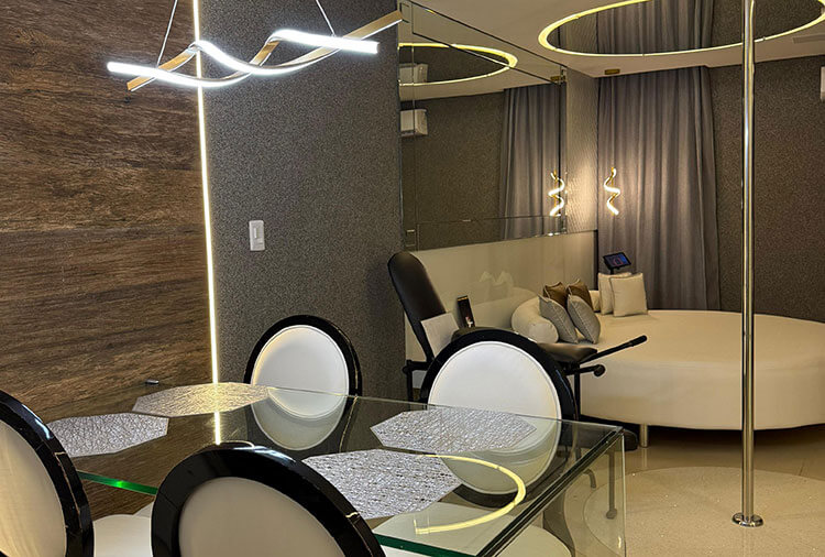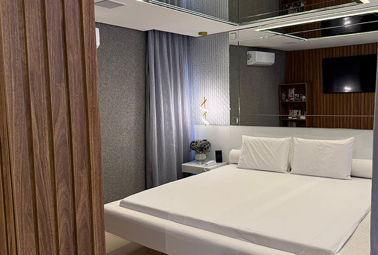 Destaque: suíte Diamante, que além de contar com hidromassagem, cadeira erótica, sauna e piscina com cascata, tem capacidade para quatro pessoas – sem taxa adicional. Sua decoração moderna também merece destaque, pois proporciona experiências inesquecíveis aos hóspedes
