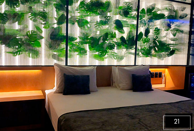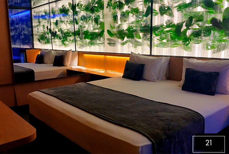 O motel conta com seis tipos diferentes de acomodações, todas muito modernas e com valores que condizem com a qualidade do espaço. Todas elas possuem canal erótico, ar condicionado, frigobar, ducha dupla, som e TV.