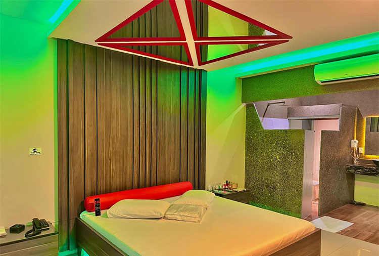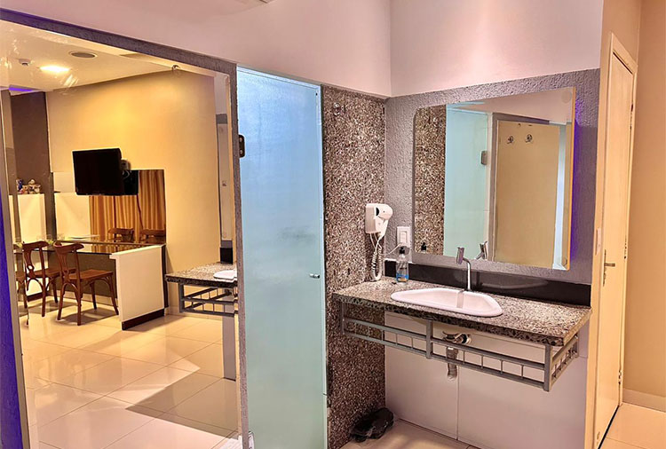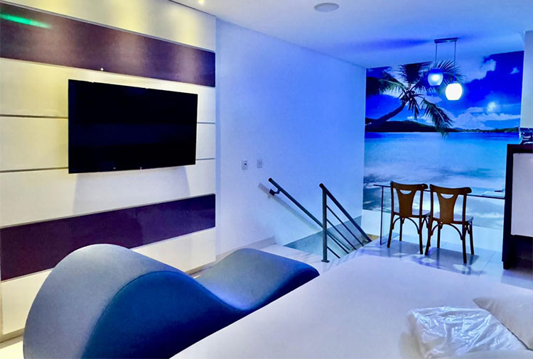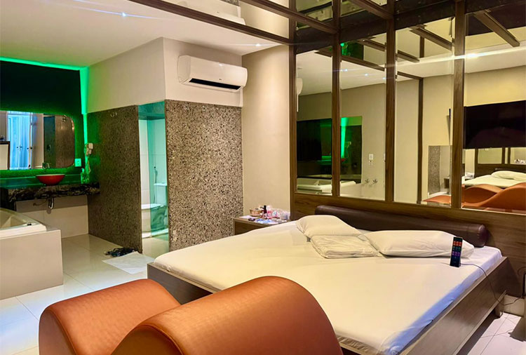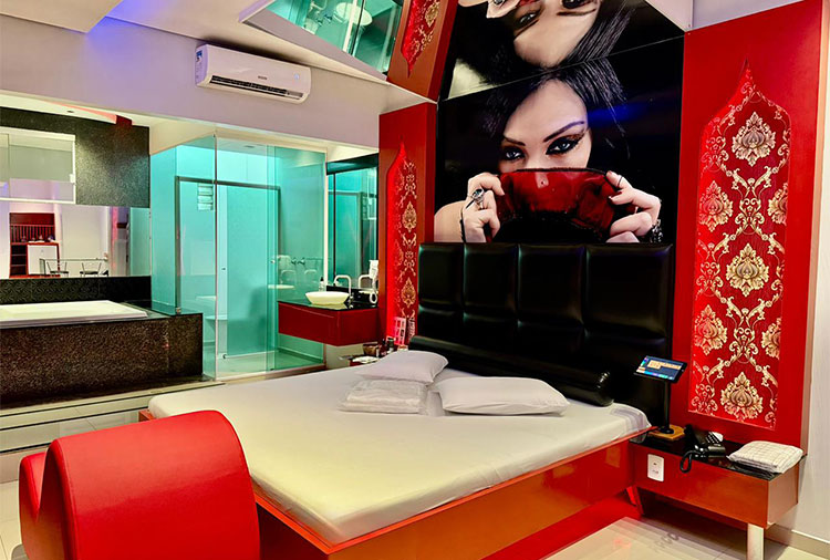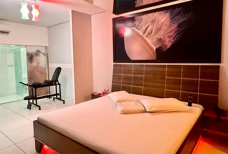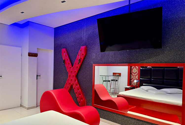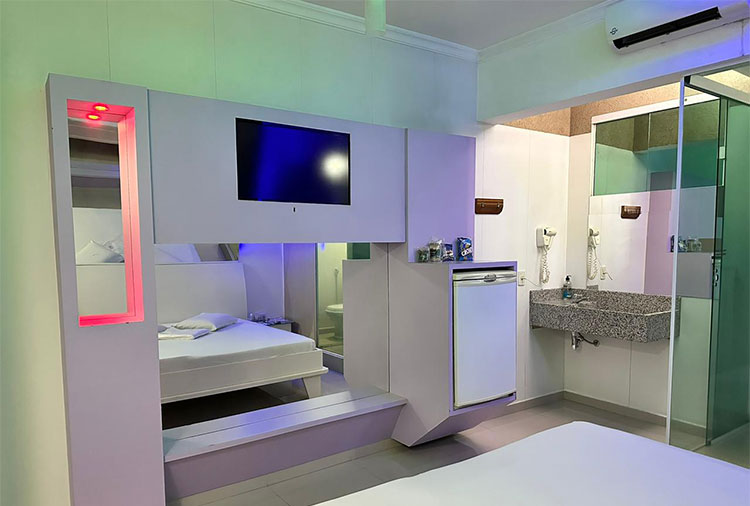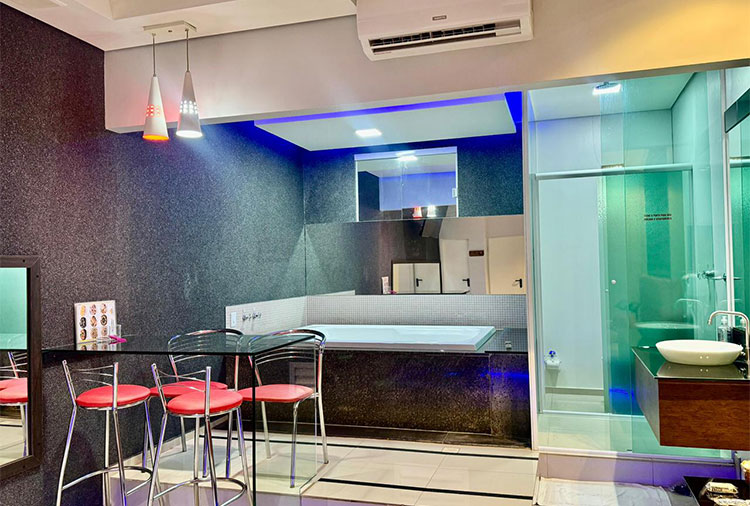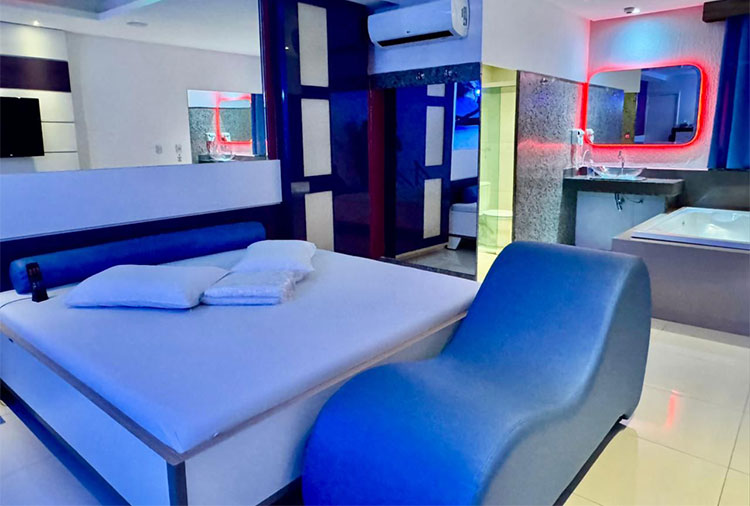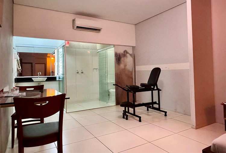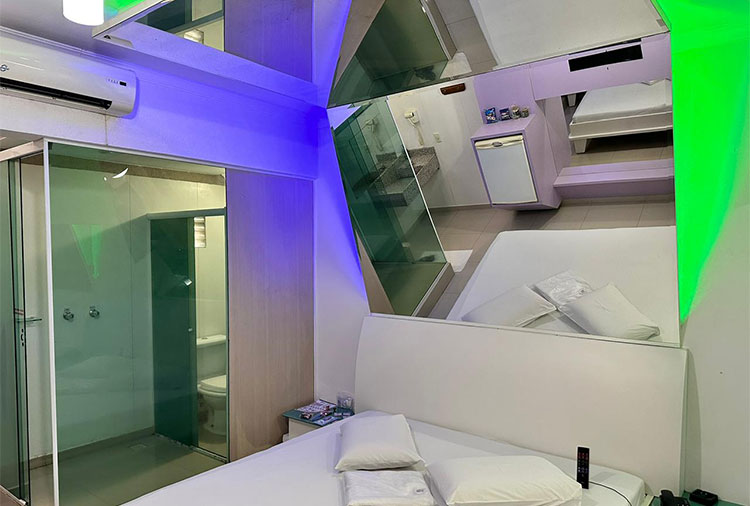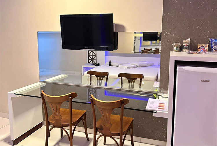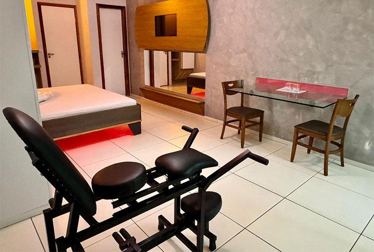 Suítes equipadas com: ar-Condicionado, canal erótico, frigobar, garagem privativa, internet Wi-Fi, saleta para refeições e TV com canal erótico