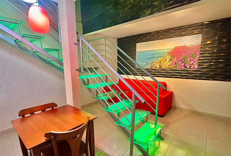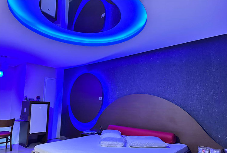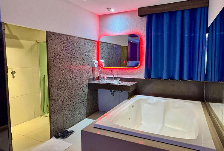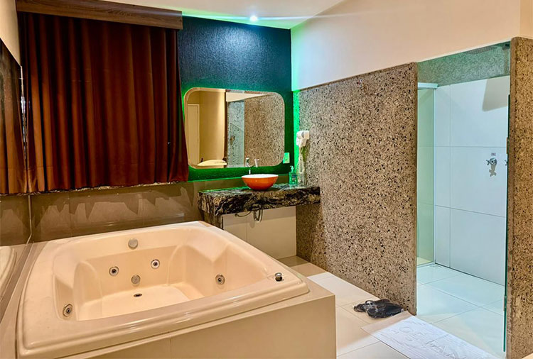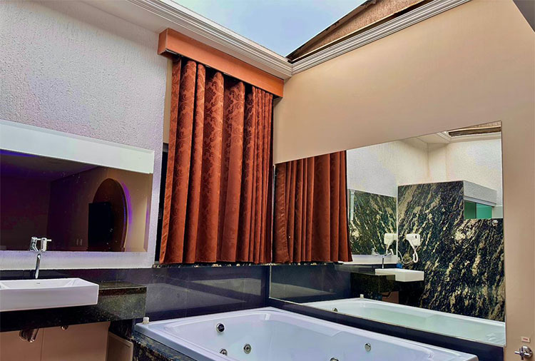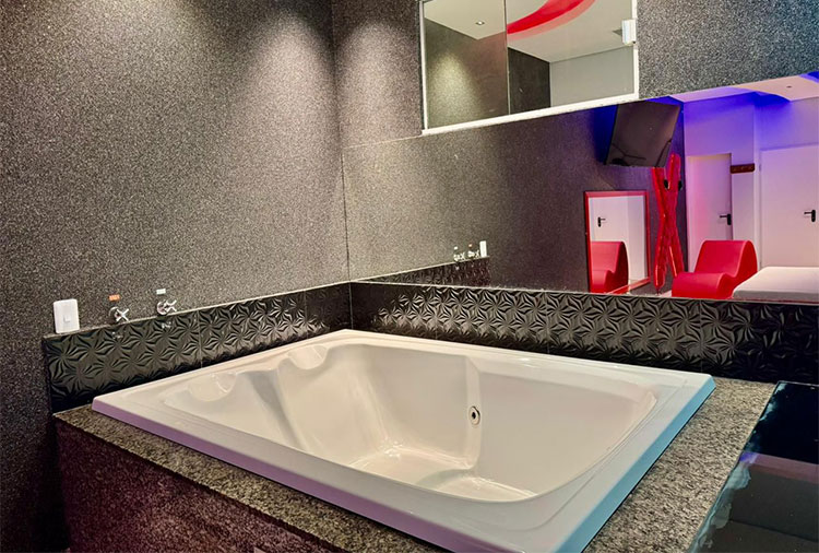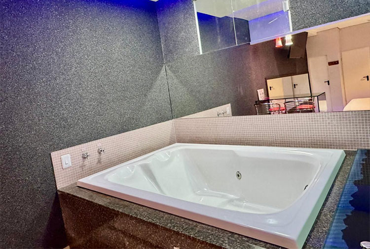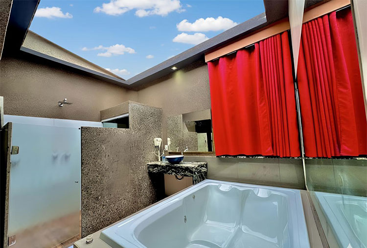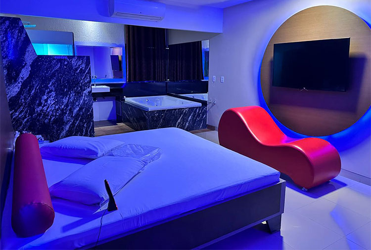 Destaque: a suíte Super Luxo com Teto Solar oferece o ambiente ideal para curtir momentos especiais com quem você ama. Ela conta com pole dance, globo giratório, hidromassagem e um teto solar, que torna a experiência ainda mais marcante. Não fique fora dessa!