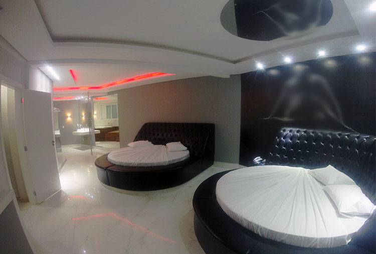 Destaque: A Suíte Glamour oferece uma experiência completa de conforto, com duas camas espaçosas, hidro SPA para até quatro pessoas, ducha dupla e um espaço com pole dance para momentos ainda mais marcantes