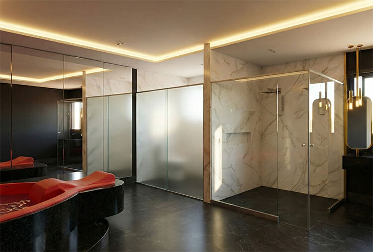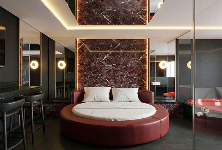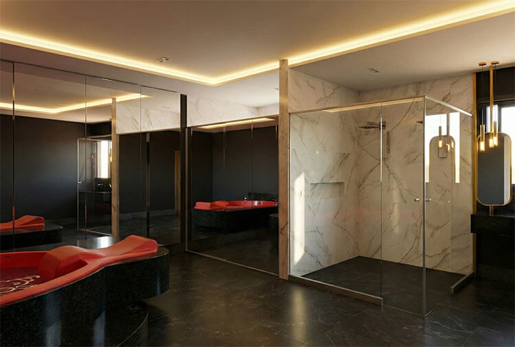 Suítes equipados com: ar-condicionado, frigobar, garagem privativa, internet Wi-Fi, canal de som e TV com canal erótico