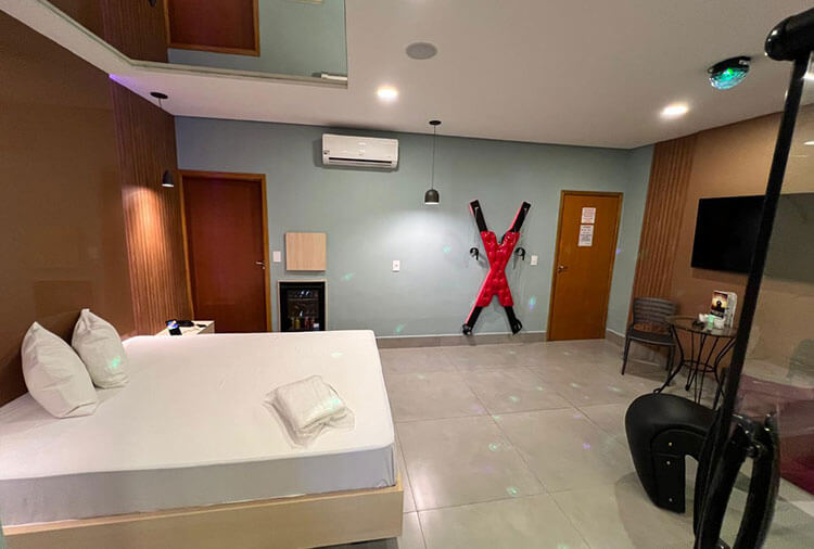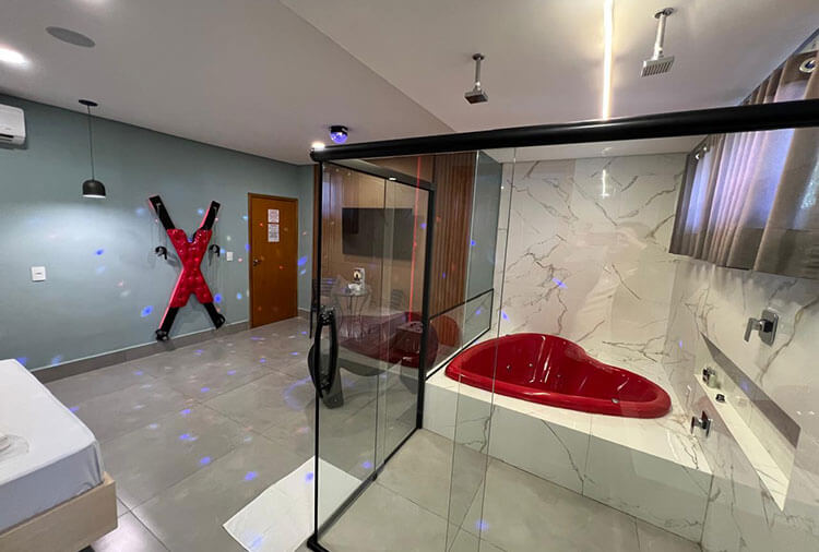 Destaque: a Suíte Elegance conta com hidromassagem em formato de coração, X erótico, poltrona erótica e iluminação especial para tornar sua noite inesquecível