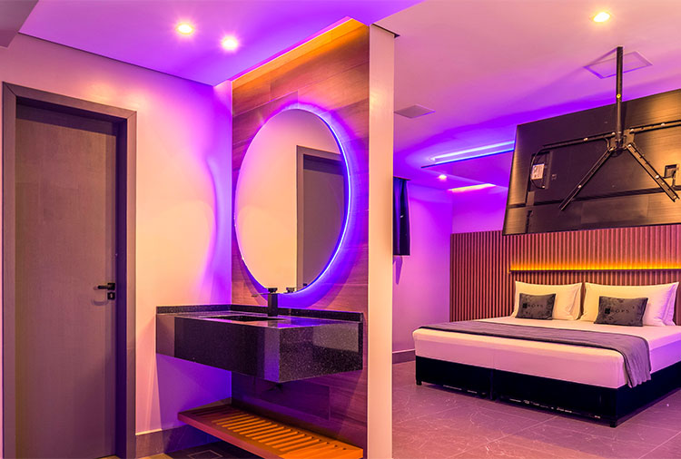 E mais: com amplo espaço a suíte Club 800 possui um ambiente com iluminação especial, luz negra e cromoterapia, além de itens como banheira de hidromassagem, sauna, lareira, pole dance, churrasqueira, três camas e garagem para dois carros com portão eletrônico.