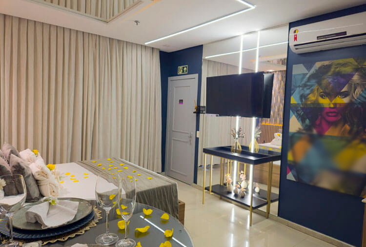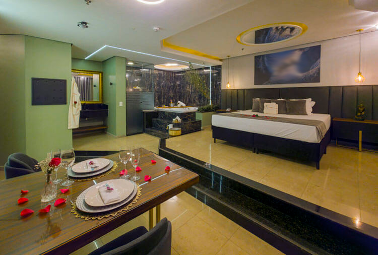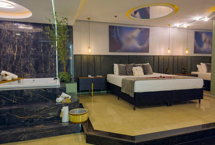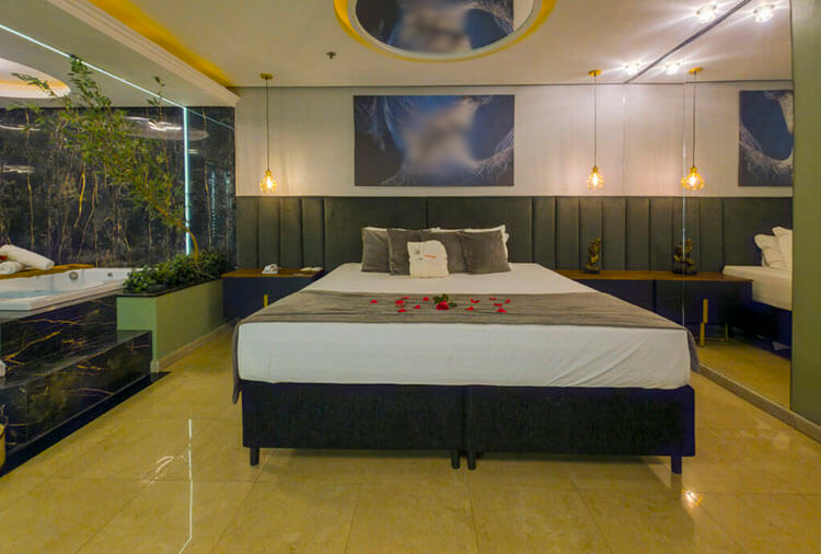 Destaque: As suítes Premium e Boutique, possuem um ambiente sofisticado e completo para momentos inesquecíveis. Equipadas com Alexa integrada, cama king size, ducha e hidro spa de 1500 litros, ainda contam com teto retrátil sobre a hidro, conforto e tecnologia em perfeita harmonia.