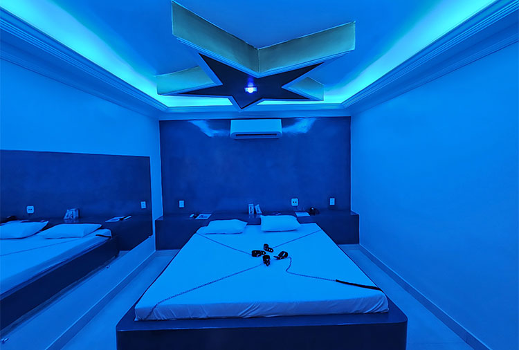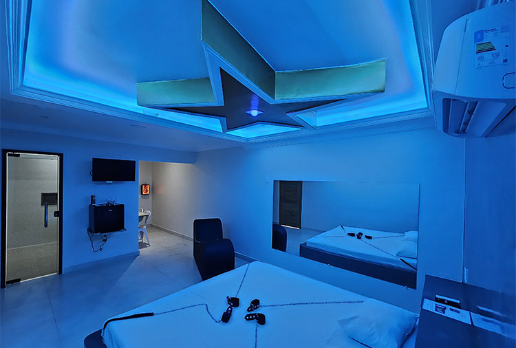 Suítes equipadas com: ar-condicionado, ducha, frigobar, garagem privativa, som e TV com canal erótico