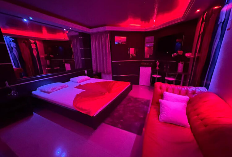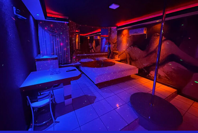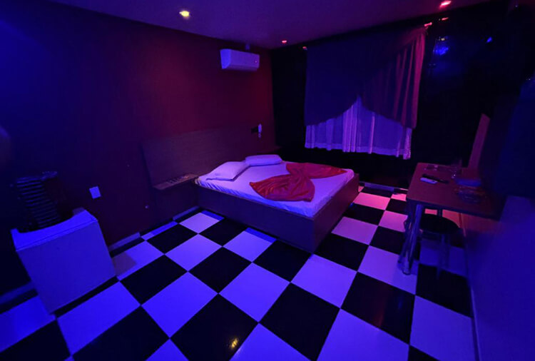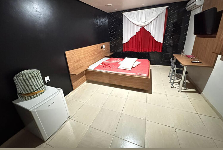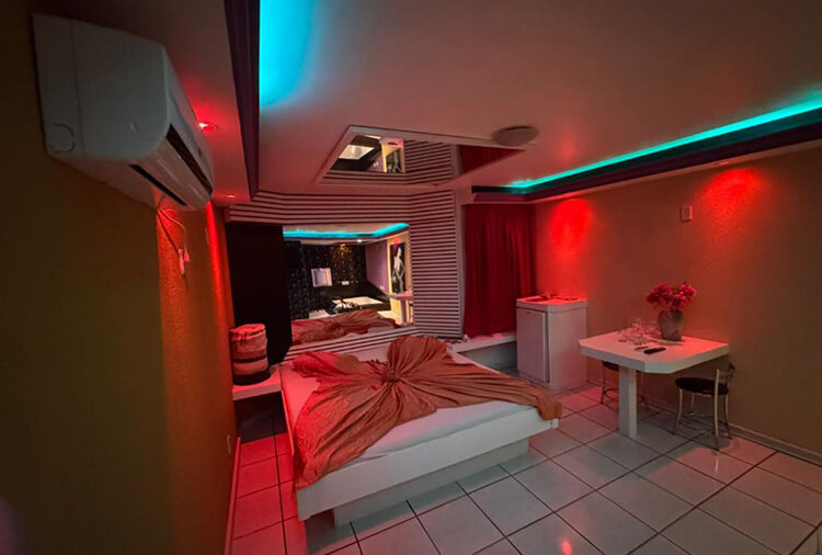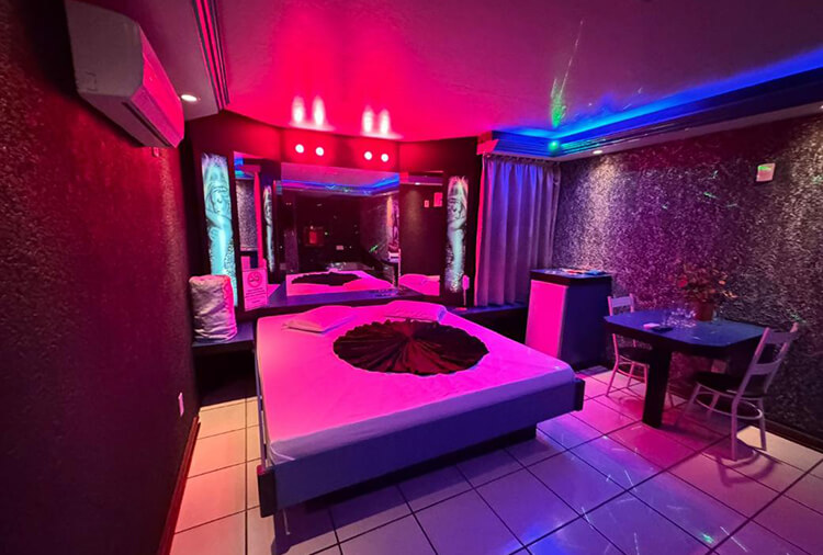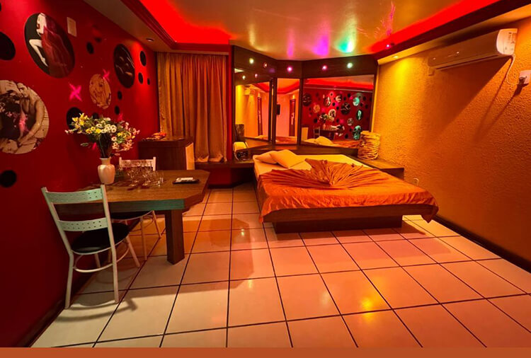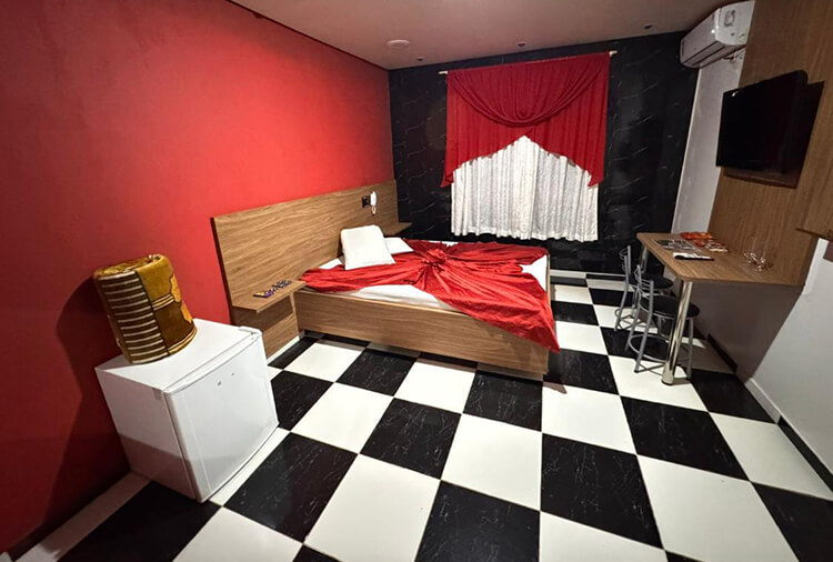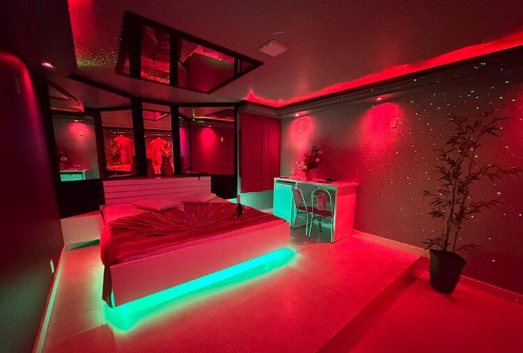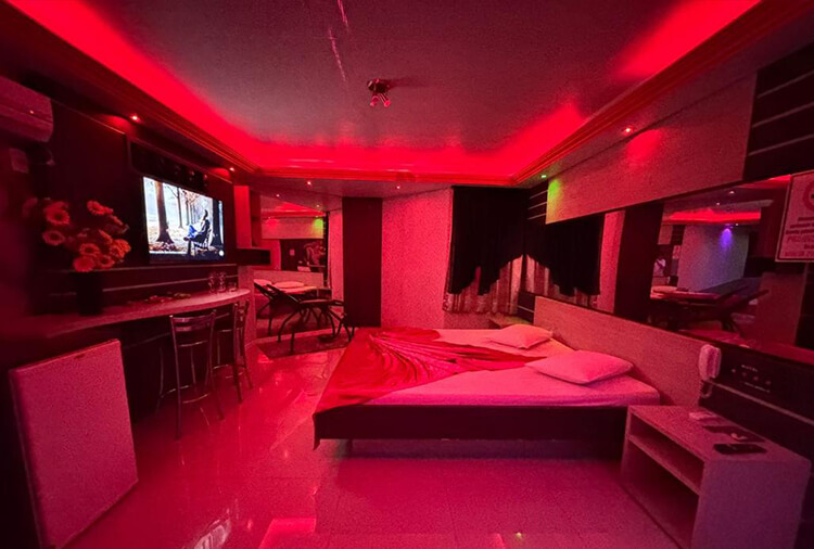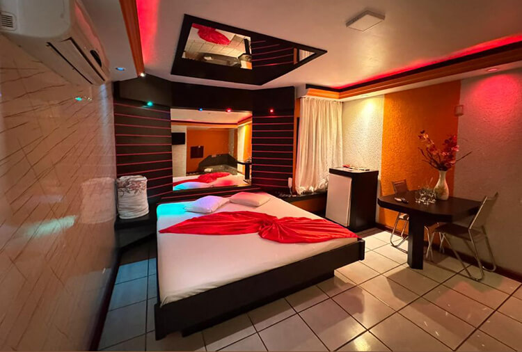 Suítes equipadas com: ar-condicionado, frigobar, garagem privativa, iluminação especial, internet Wi-Fi, saleta para refeições, som e TV com canal erótico