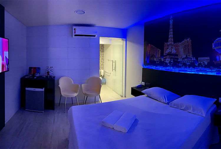 Suítes equipadas com: ar-condicionado, ducha, frigobar, iluminação especial, internet Wi-Fi, TV com canal erótico