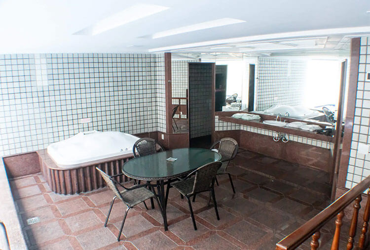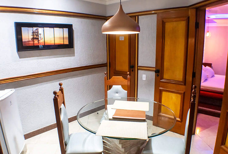 Suítes equipadas com: ar-condicionado, frigobar, iluminação especial, saleta para refeições, som e TV