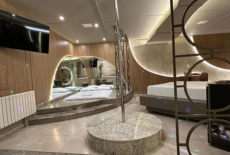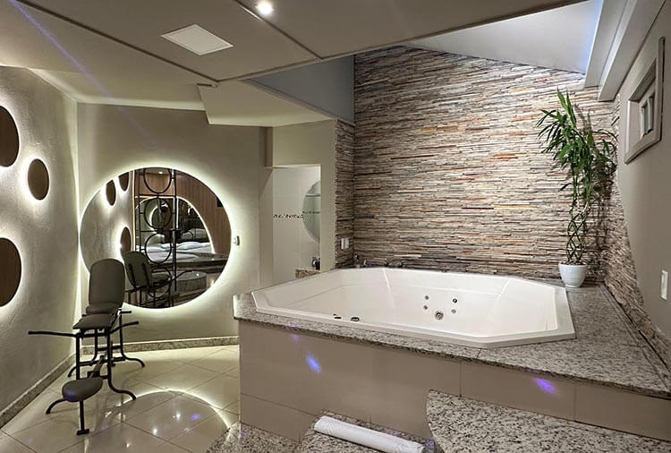 Destaque: suíte A, ampla e equipada com uma relaxante hidro spa, colchão d'água, poltrona erótica, lareira – perfeita para momentos inesquecíveis!