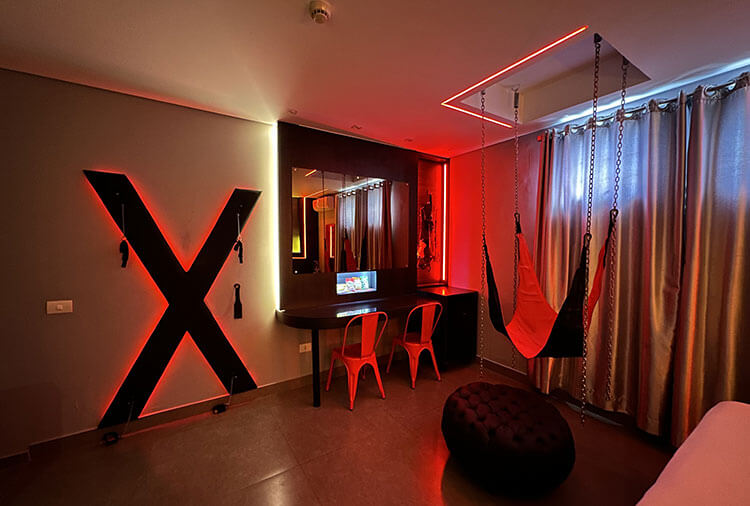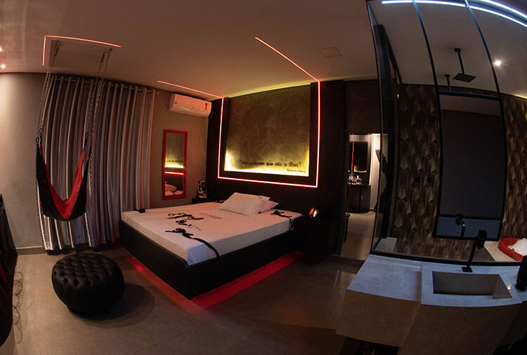 Suítes equipados com: ar-condicionado, canal erótico, ducha, frigobar, garagem privativa, internet Wi-Fi, secador de cabelo e TV