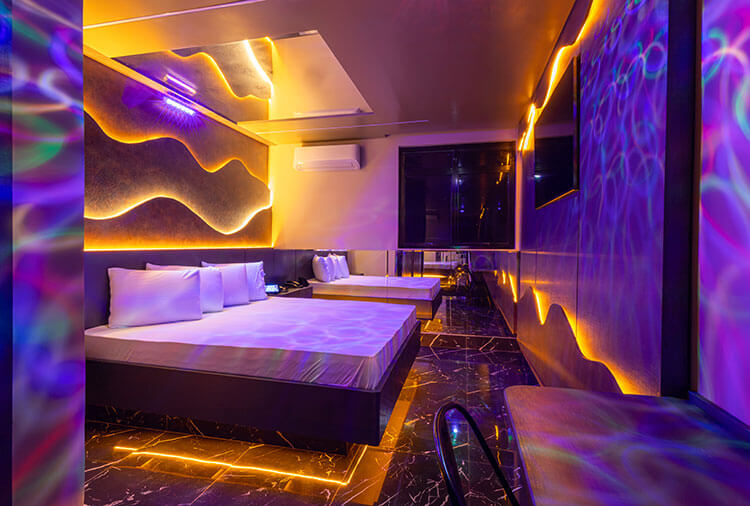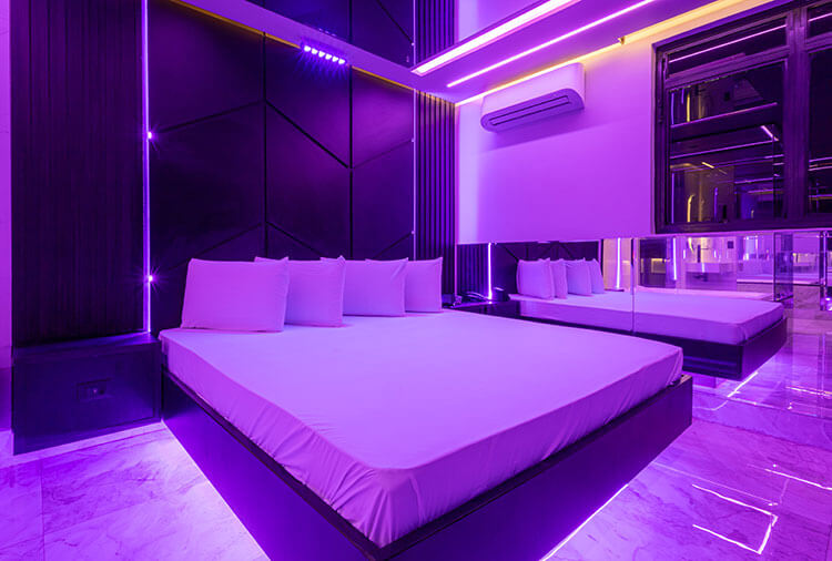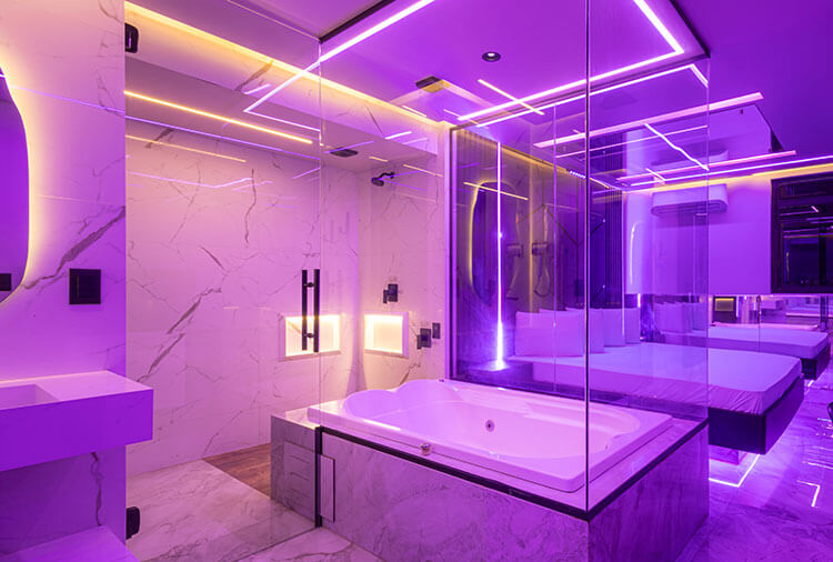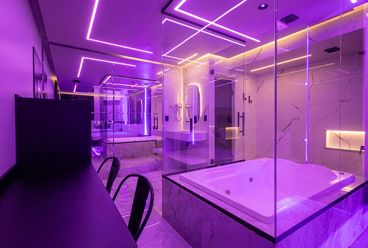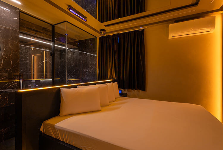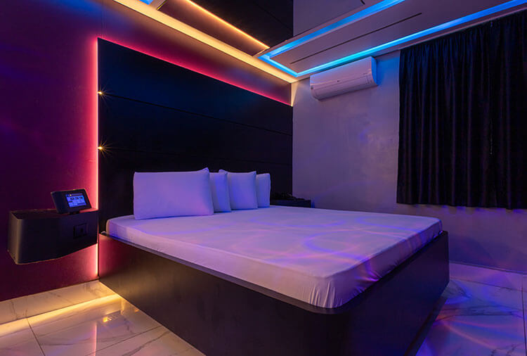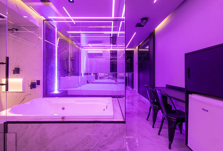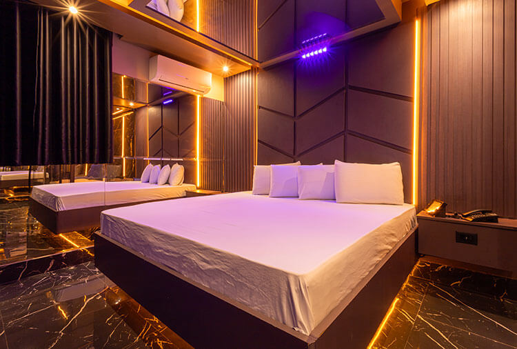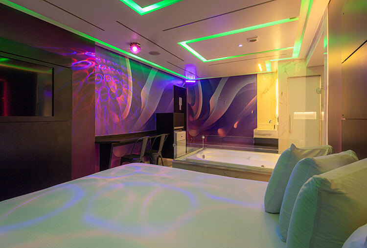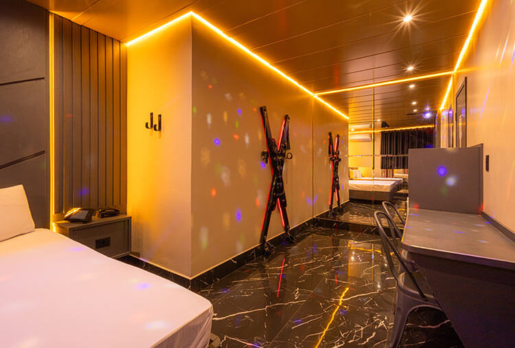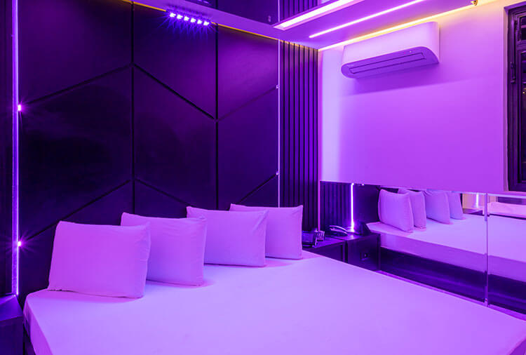 Equipadas com: ar-condicionado, ducha, frigobar, garagem privativa, internet Wi-Fi, secador de cabelo, som e TV com canal erótico
