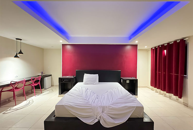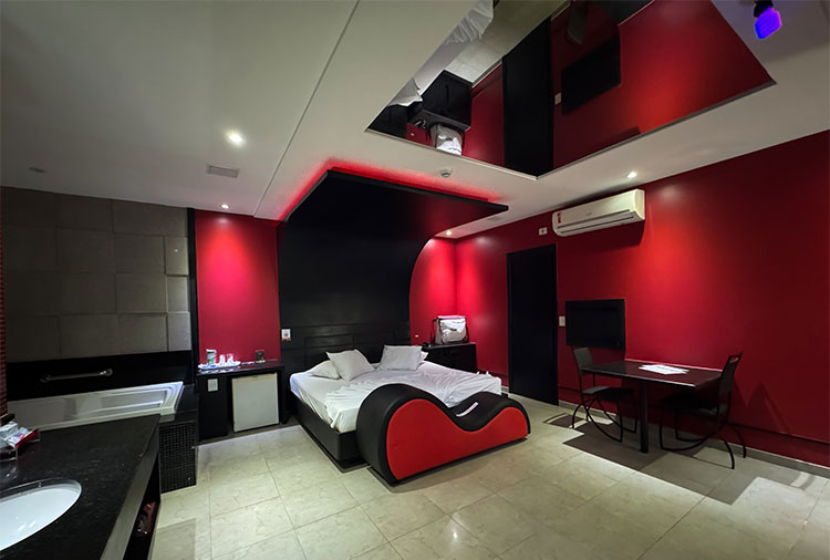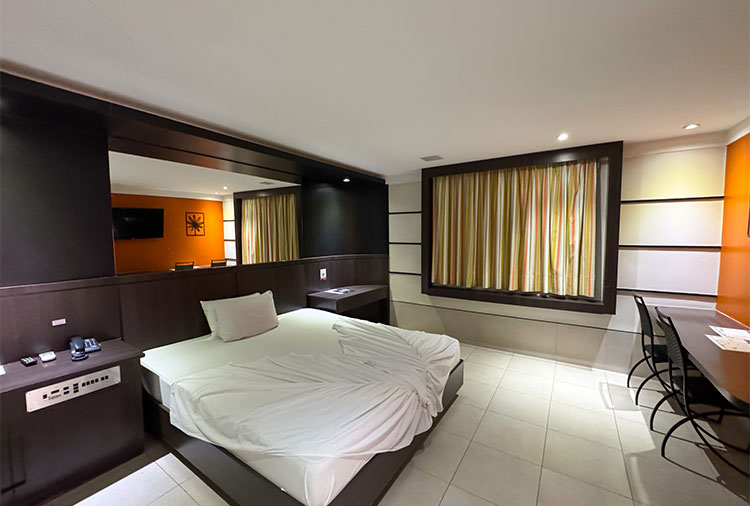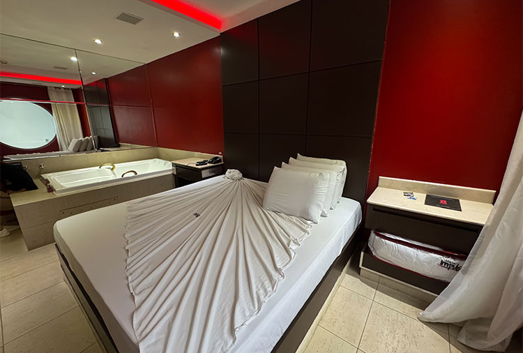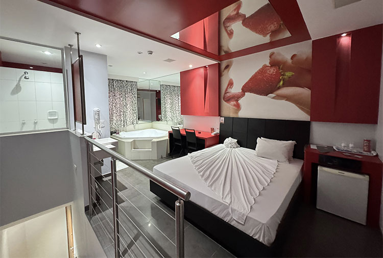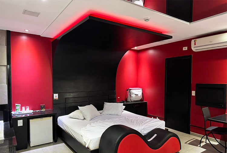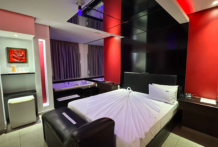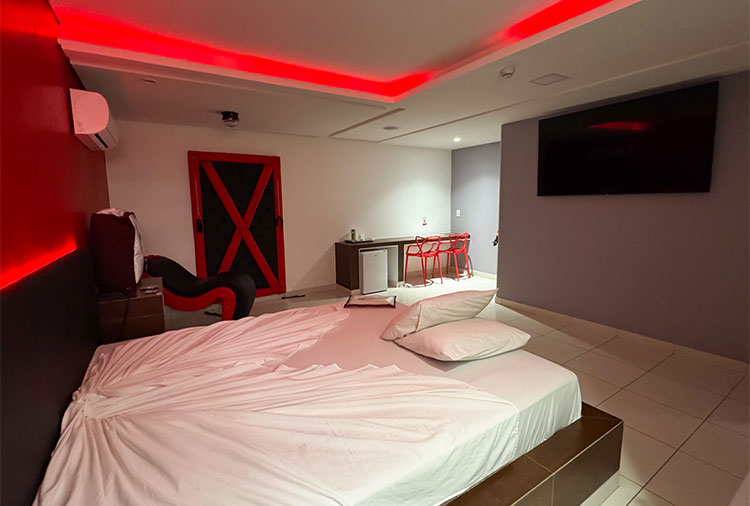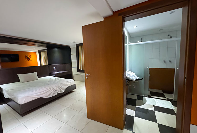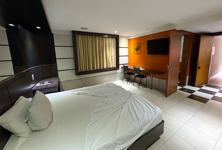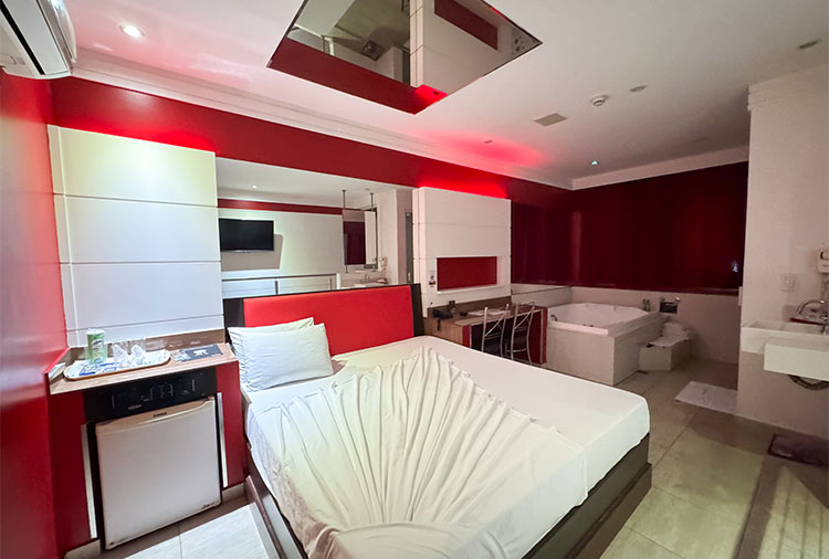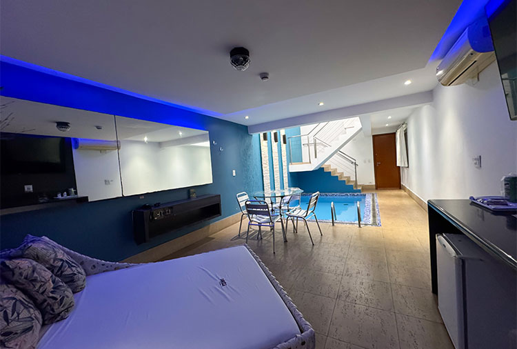 Suítes equipadas com: ar-condicionado, ducha dupla, frigobar, TV, som e garagem privativa