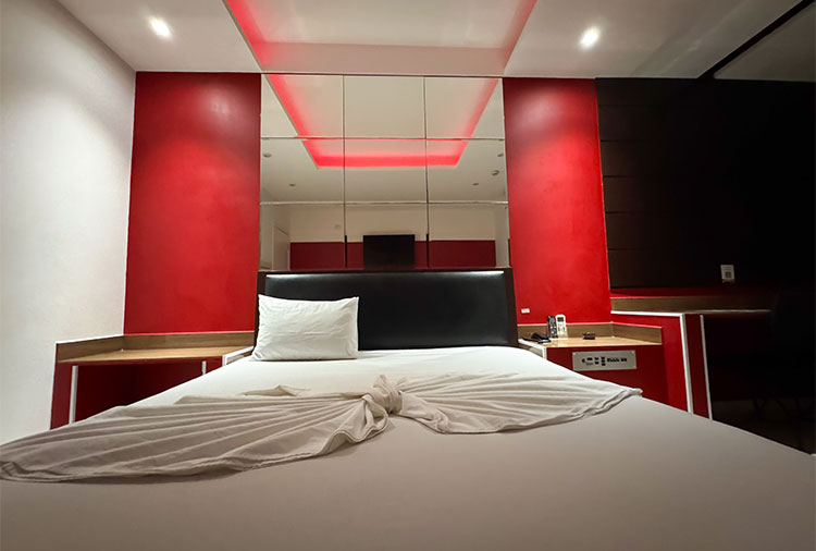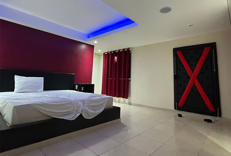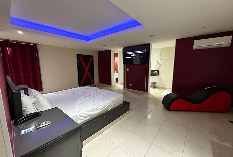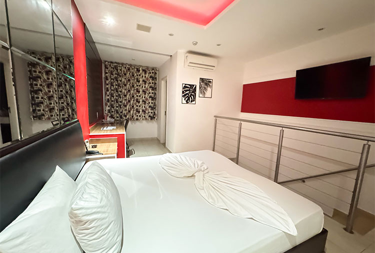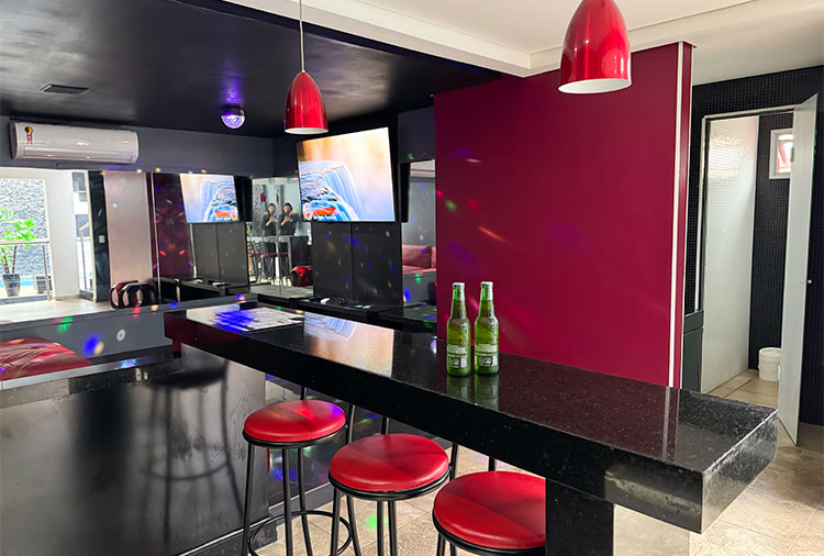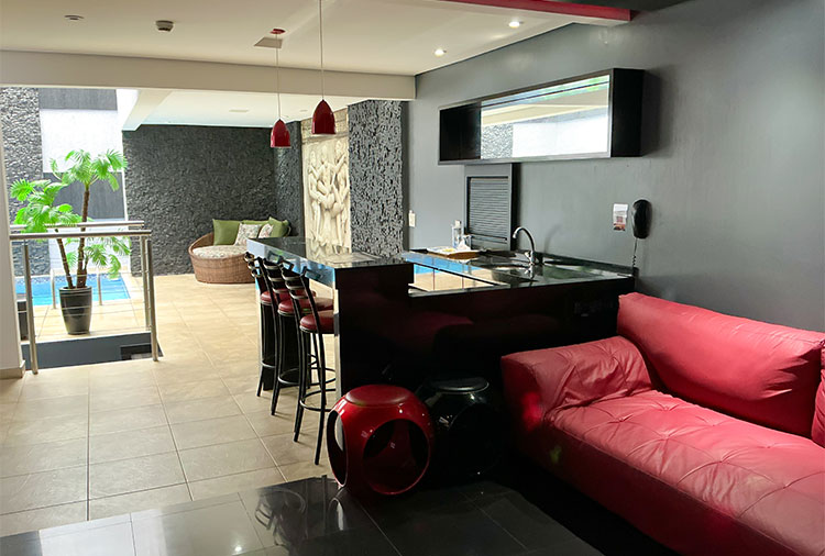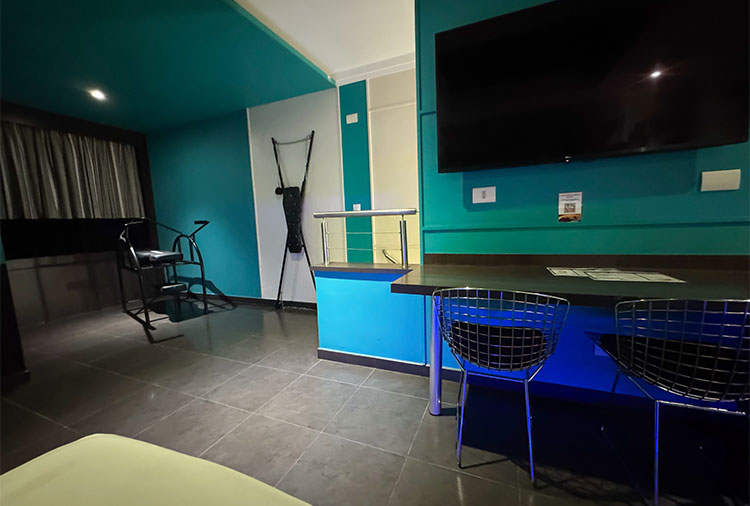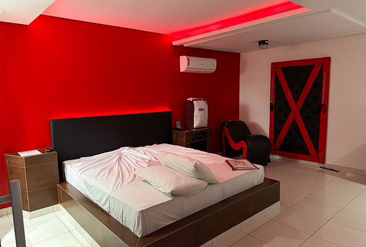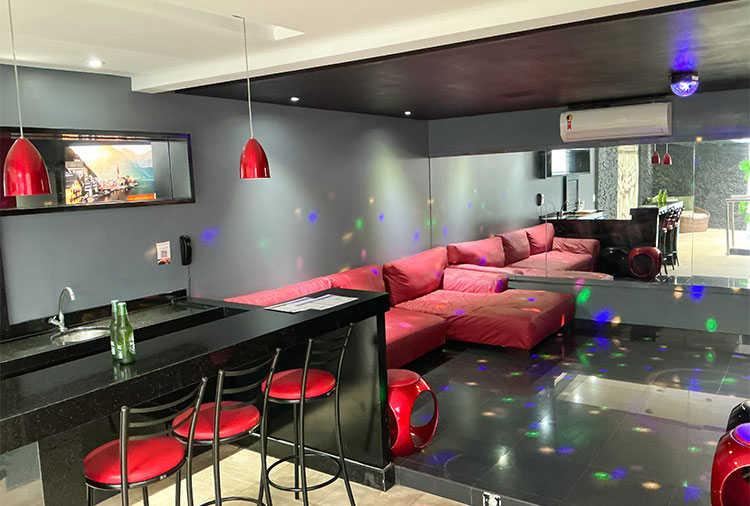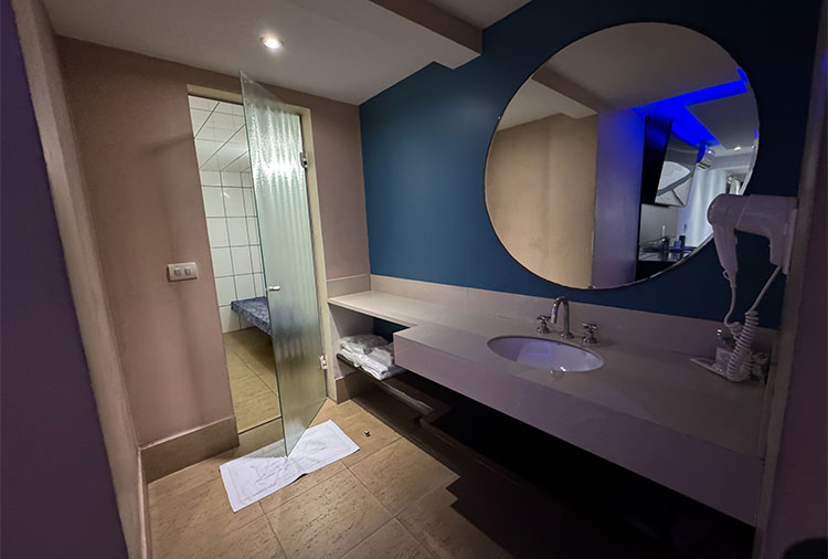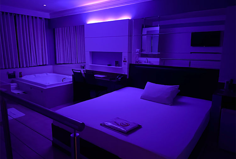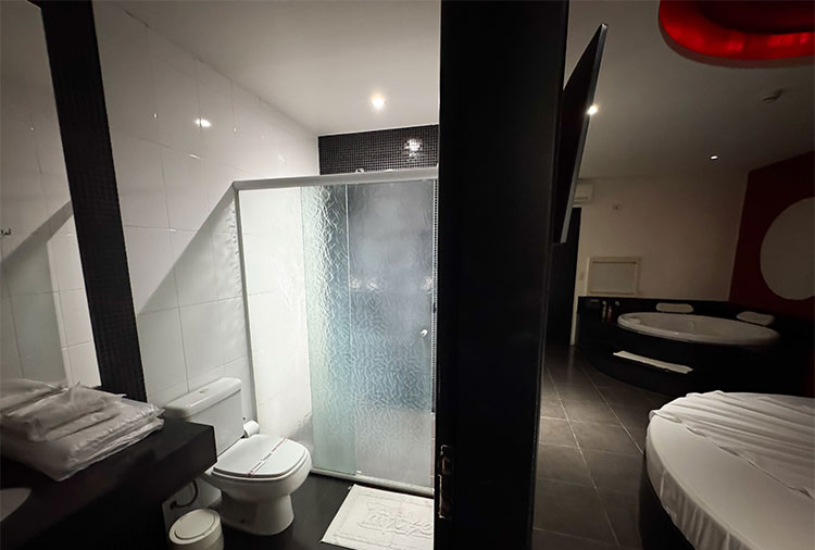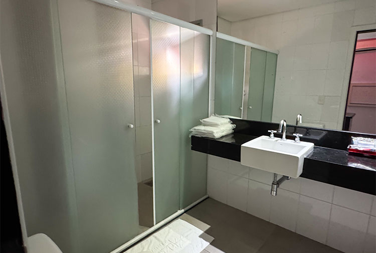 Suítes equipadas com: ar-condicionado, ducha dupla, frigobar, TV, som e garagem privativa
