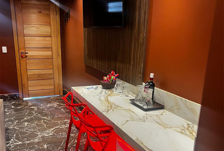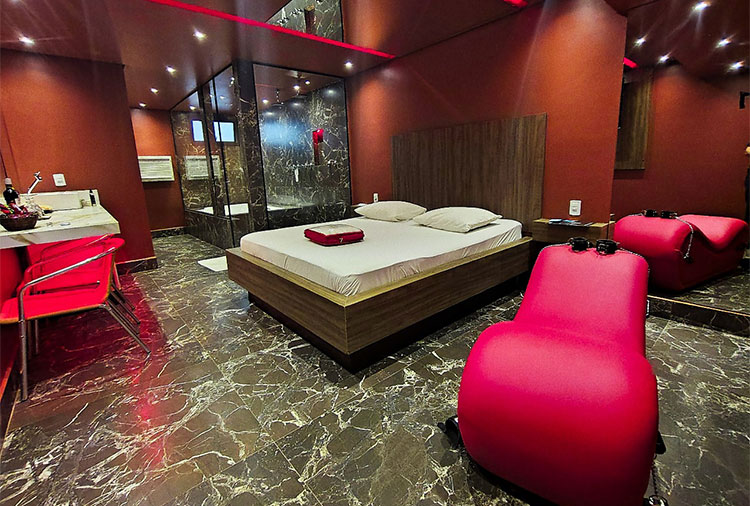 Suítes equipadas com: frigobar, internet Wi-fi, secador de cabelo e TV com canal erótico