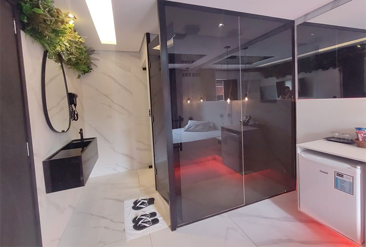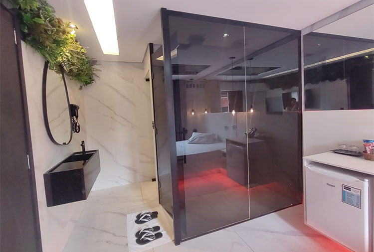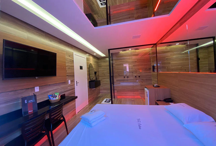 Suítes equipados com: ar-condicionado, frigobar, Wi-Fi, saleta para refeições, som e TV com canal erótico