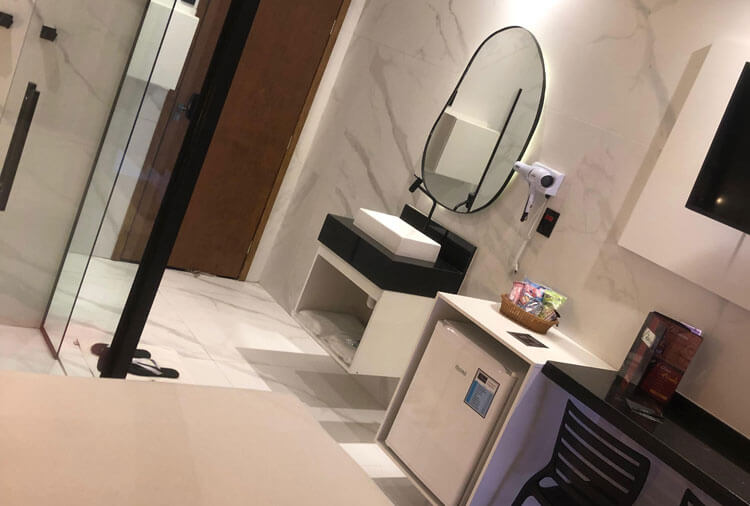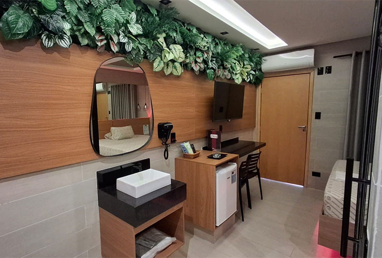 Suítes equipados com: ar-condicionado, ducha, garagem privativa, saleta para refeições, som e TV