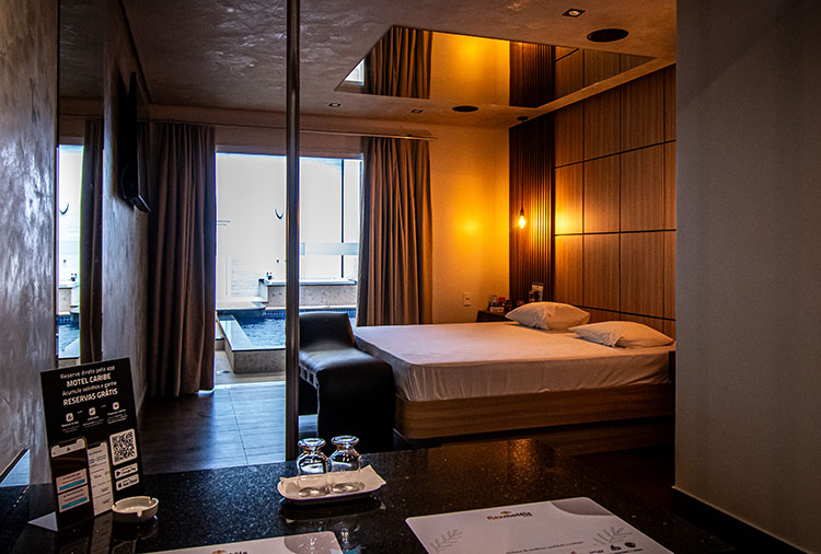 Destaque: com capacidade para 50 pessoas, a suíte Caribe Premium é perfeita para quem está em busca de promover uma comemoração diferenciada. Ampla, moderna e sofisticada, a acomodação possui boate, mesa de sinuca, piscina spa e garagem com capacidade para sete carros, além de cadeira erótica, sauna, teto solar, espaço sado e seis duchas