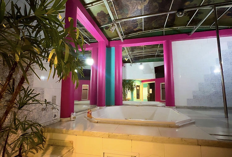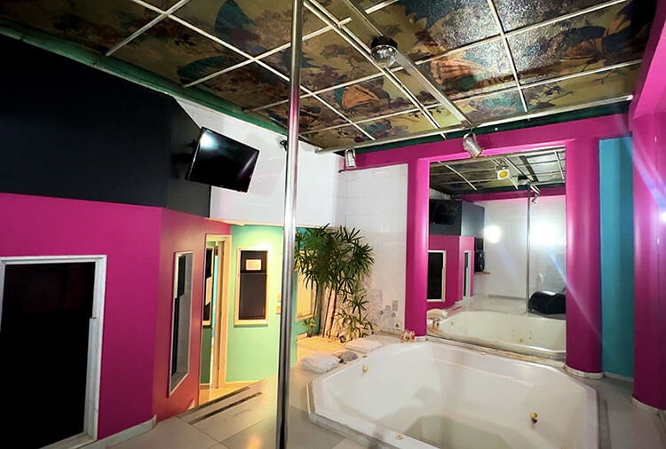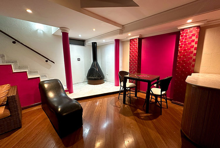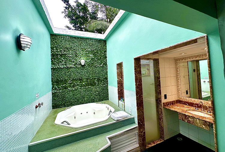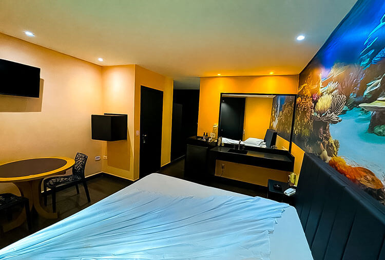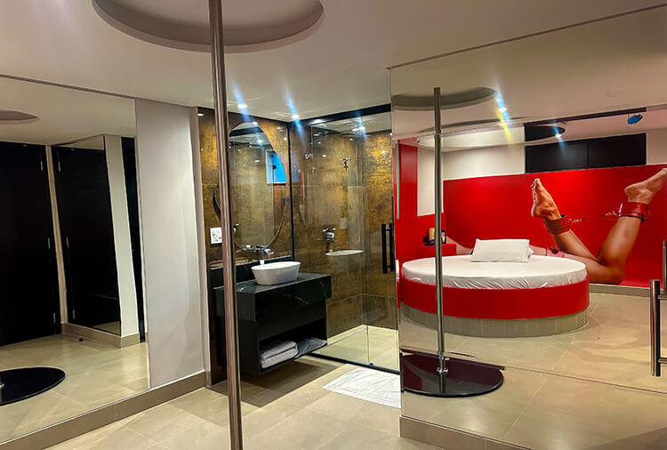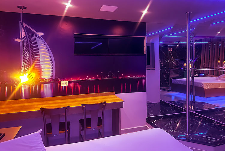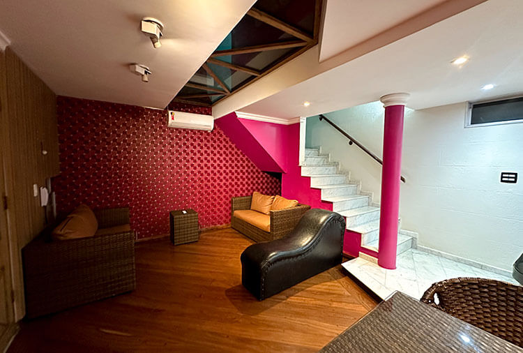 Destaque: Suite Amsterdã é a suíte para realizar sua festa particular, capacidade para 35 pessoas, dois andares divididos entre o andar de cima com uma ampla suíte com hidromassagem e vista para a piscina. O andar de baixo conta com teto solar, piscina aquecida com cascata, salão de festa com mesa de sinuca, pole dance, churrasqueira, geladeira para bebidas e mais duas suítes que se interligam para interação entre casais.