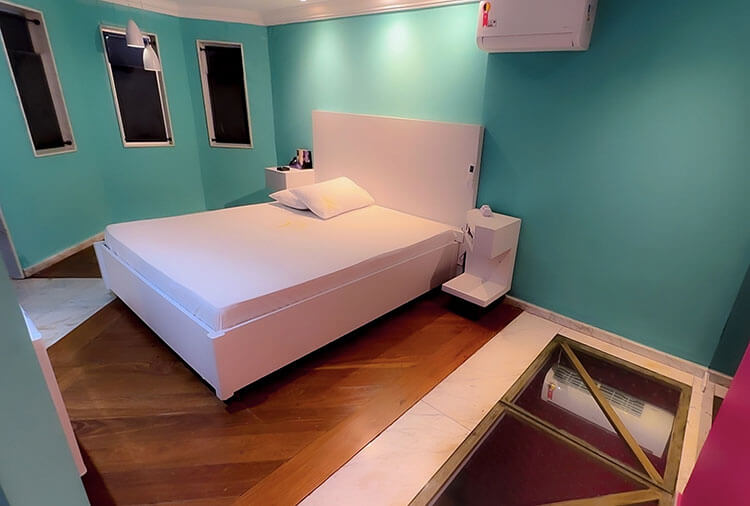 » Suíte duplex com o chão do quarto superior em vidro transparente.