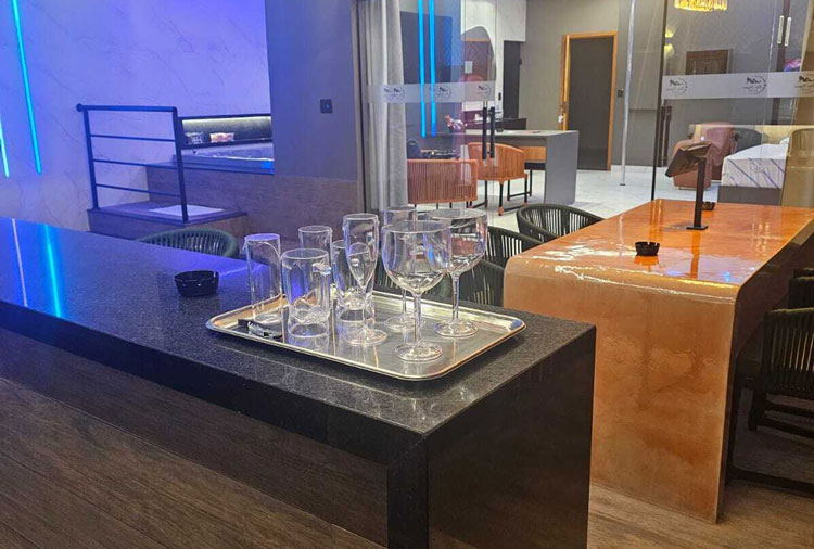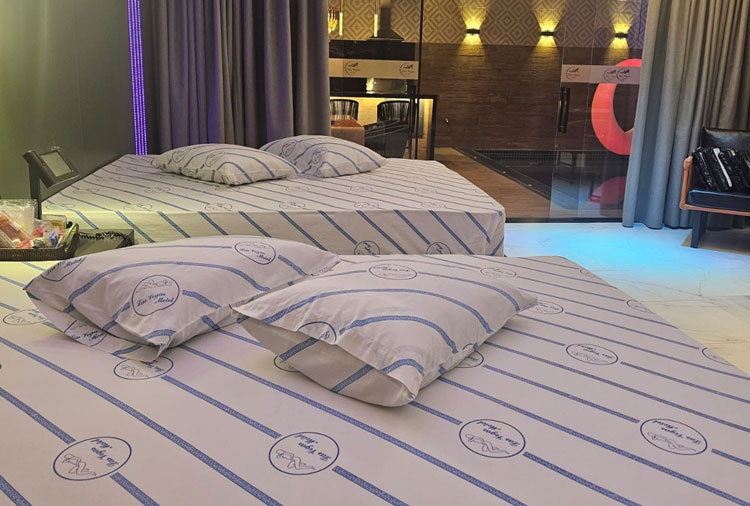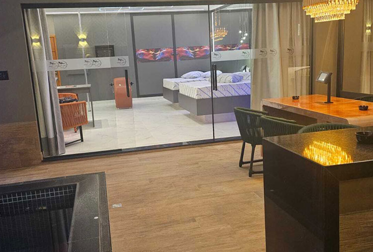 Suítes equipadas com: ar-condicionado, frigobar, saleta para refeições, secador por cabelo, som, TV com canal erótico