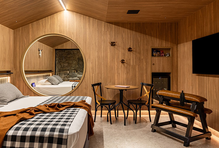 Equipadas com: ar-condicionado, ducha, frigobar, garagem privativa, internet wi-fi, secador de cabelo, TV com canal erótico
